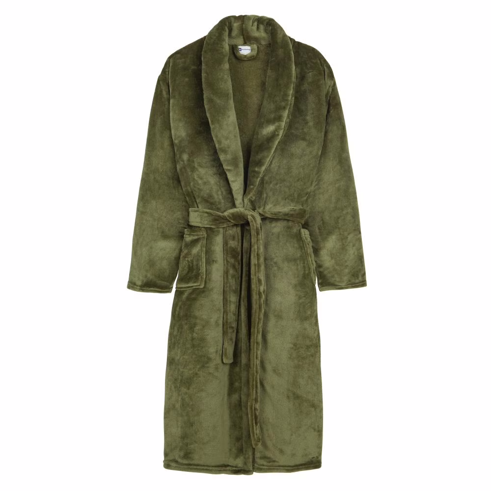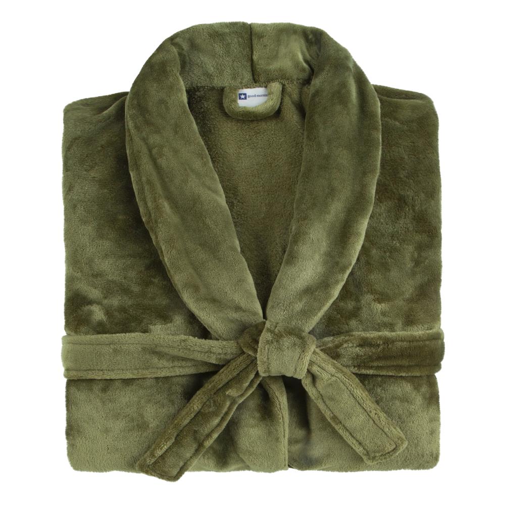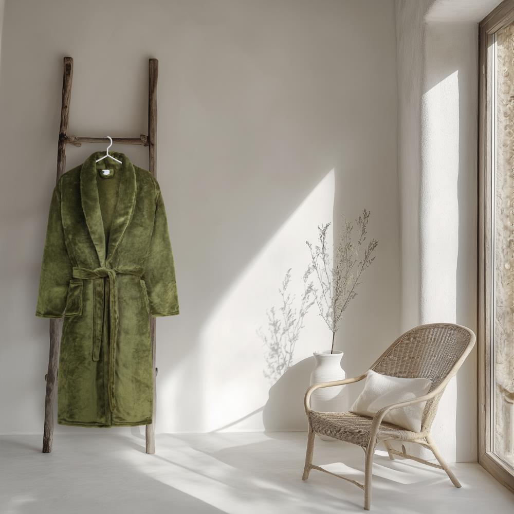 Geniet van ultiem comfort met deze zachte, effen badjas van Good Morning in de kleur olijfgroen. De badjas is zowel aan de binnen- als de buitenkant uitgevoerd in dezelfde olijfgroen kleur en voelt heerlijk zacht aan. Voorzien van handige zakken en een riem. De badjas perfect voor ontspannen momenten thuis of een dagje sauna.