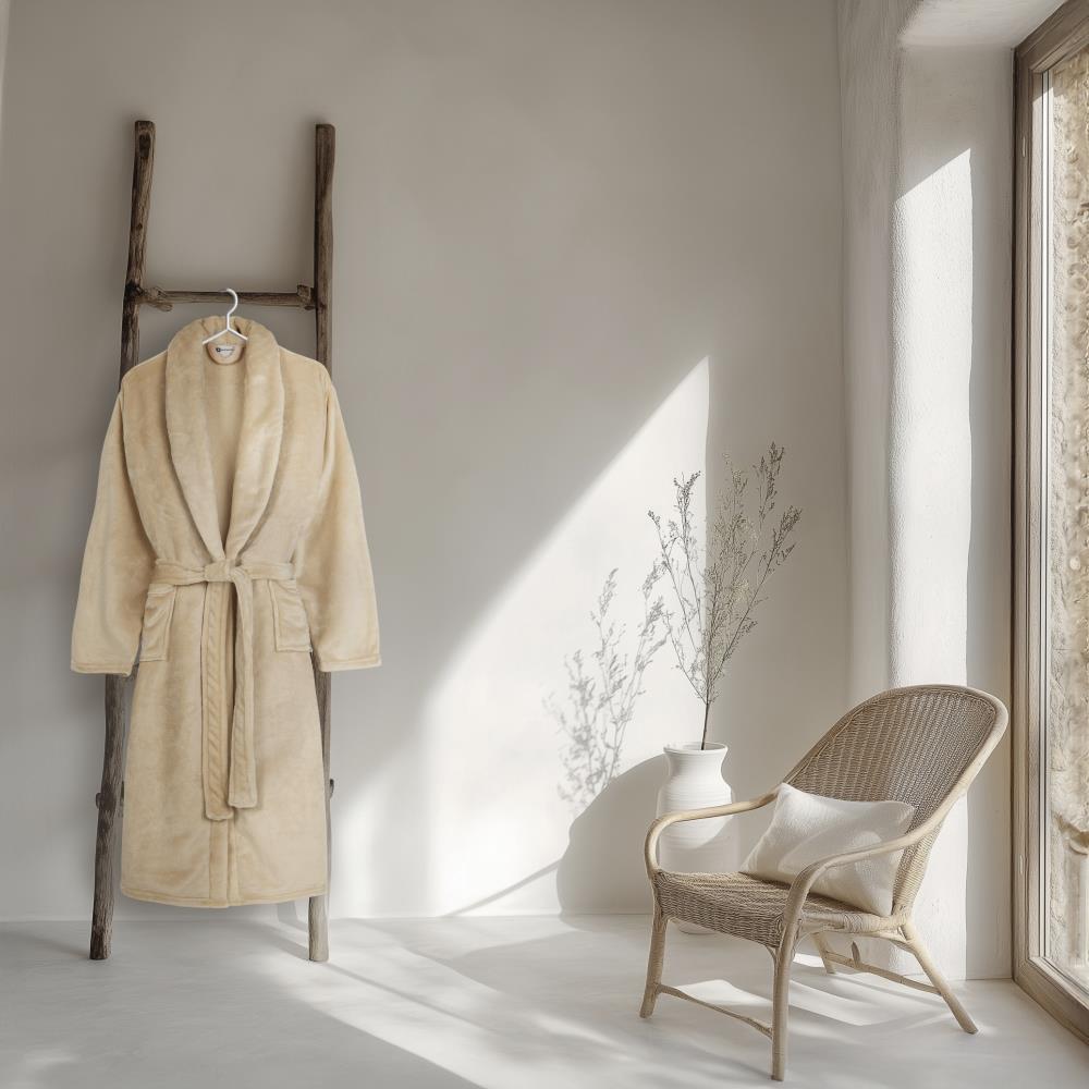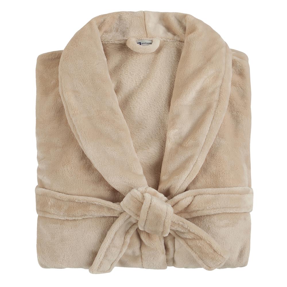 Geniet van ultiem comfort met deze zachte, effen badjas van Good Morning in de kleur zand. De badjas is zowel aan de binnen- als de buitenkant uitgevoerd in dezelfde zand kleur en voelt heerlijk zacht aan. Voorzien van handige zakken en een riem. De badjas perfect voor ontspannen momenten thuis of een dagje sauna.
