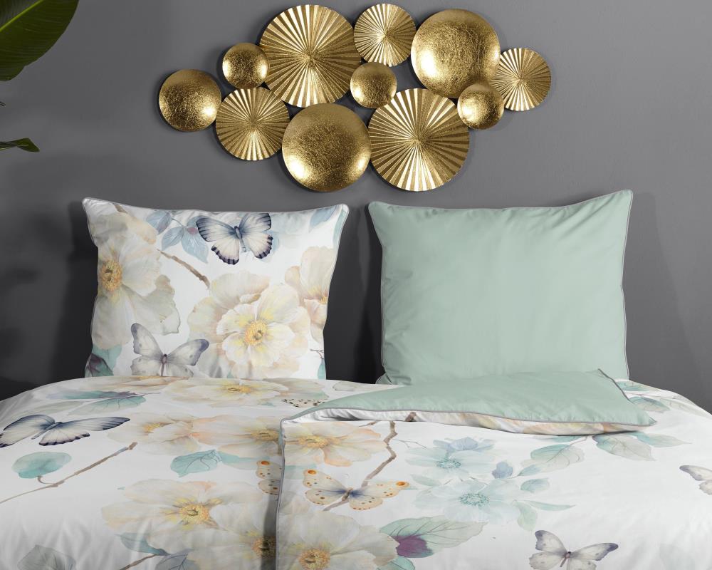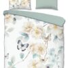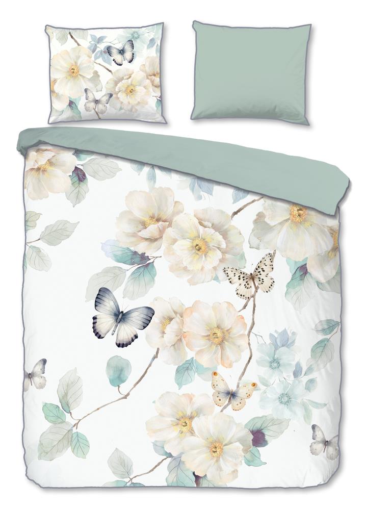 Satijnen dekbedovertrek Adiwanya van Descanso. Dit dekbedovertrek met bloemen en vlinders, in de kleur wit, is gemaakt van 100% katoen-satijn. Descanso dekbedovertrek is luxe, stijlvol en elegant. De achterkant heeft een bijpassende uni kleur.