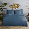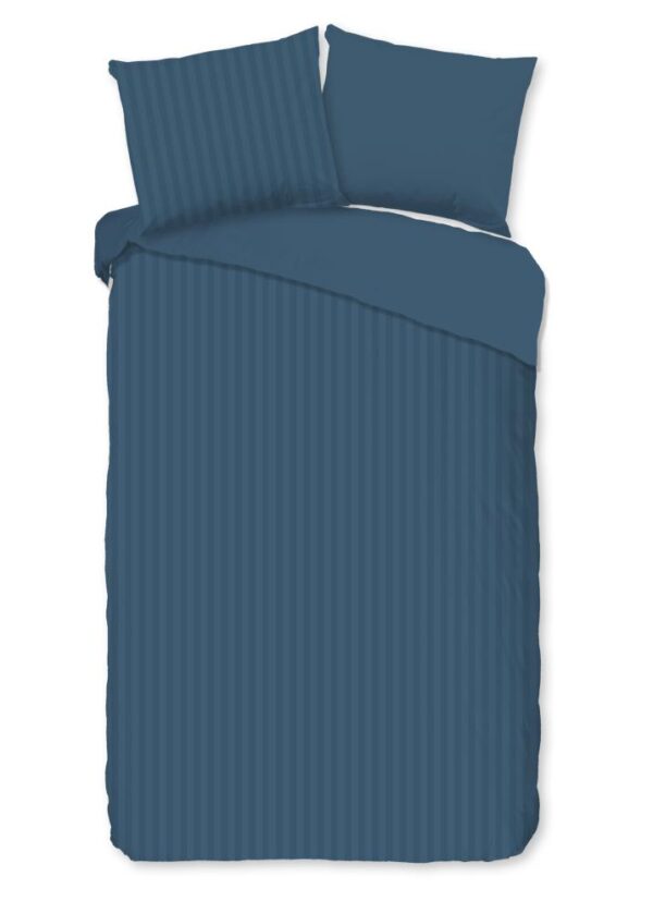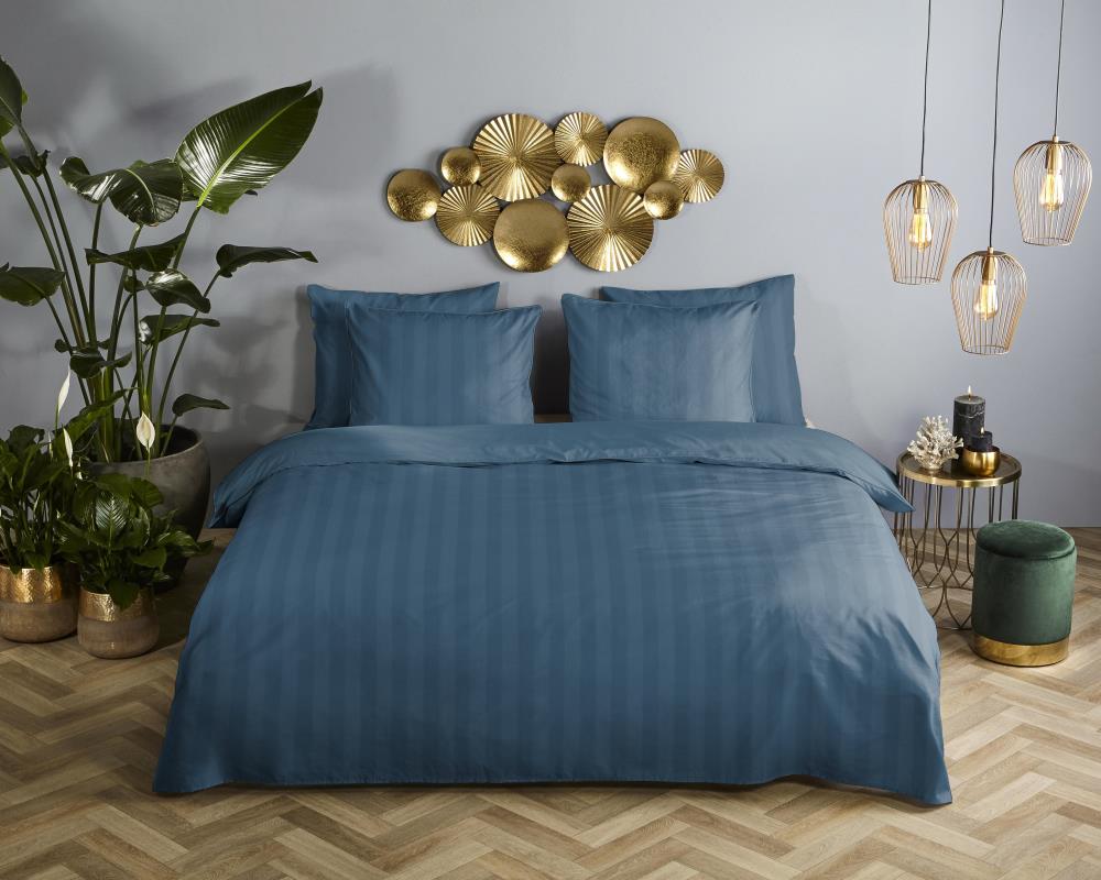 Satijnen dekbedovertrek Hotel Sevilla van Descanso. Dit dekbedovertrek met rustige satijnstreep, in de kleur denim, is gemaakt van 100% katoen-satijn. Descanso dekbedovertrek is luxe, stijlvol en elegant. De achterkant heeft een bijpassende uni kleur.