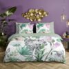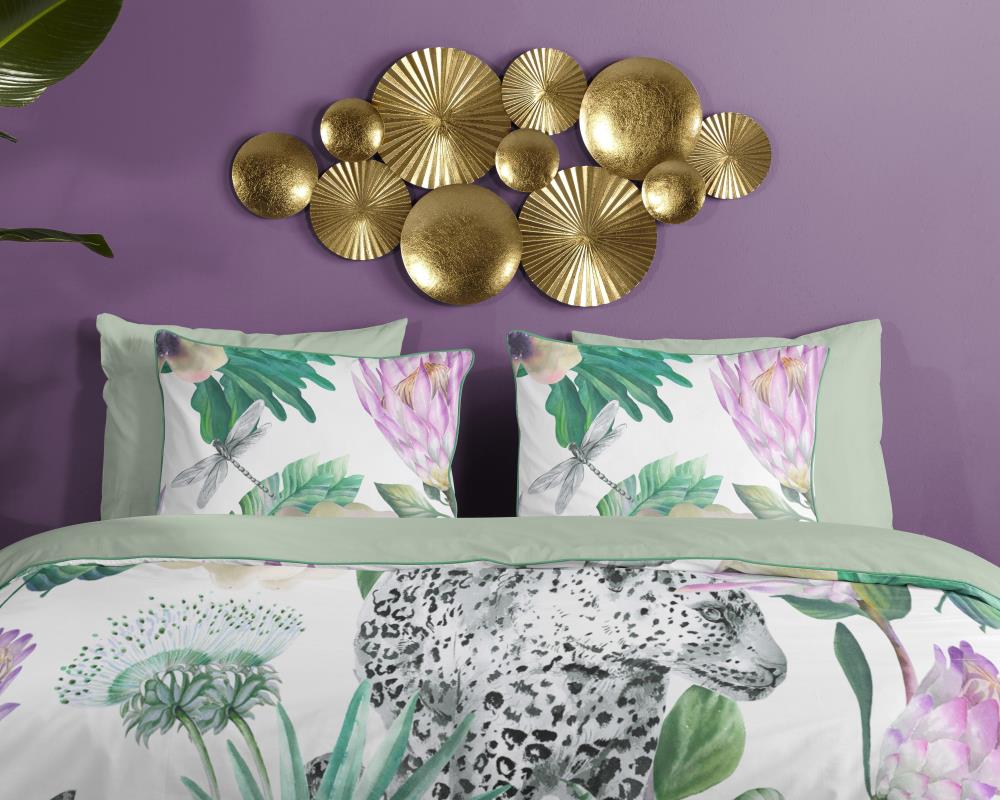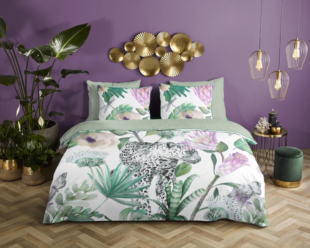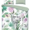 Satijnen dekbedovertrek Volterra van Descanso. Dit dekbedovertrek met bloemen met een luipaard, in de kleur groen, is gemaakt van 100% katoen-satijn. Descanso dekbedovertrek is luxe, stijlvol en elegant. De achterkant heeft een bijpassende uni kleur.