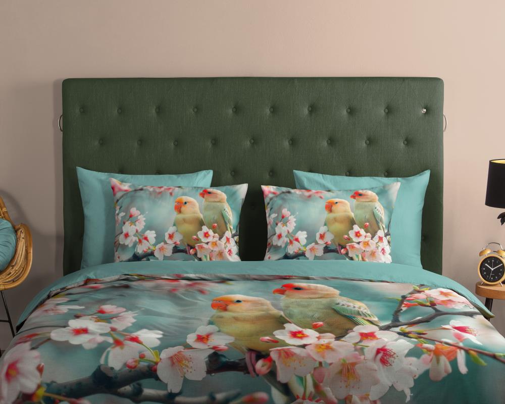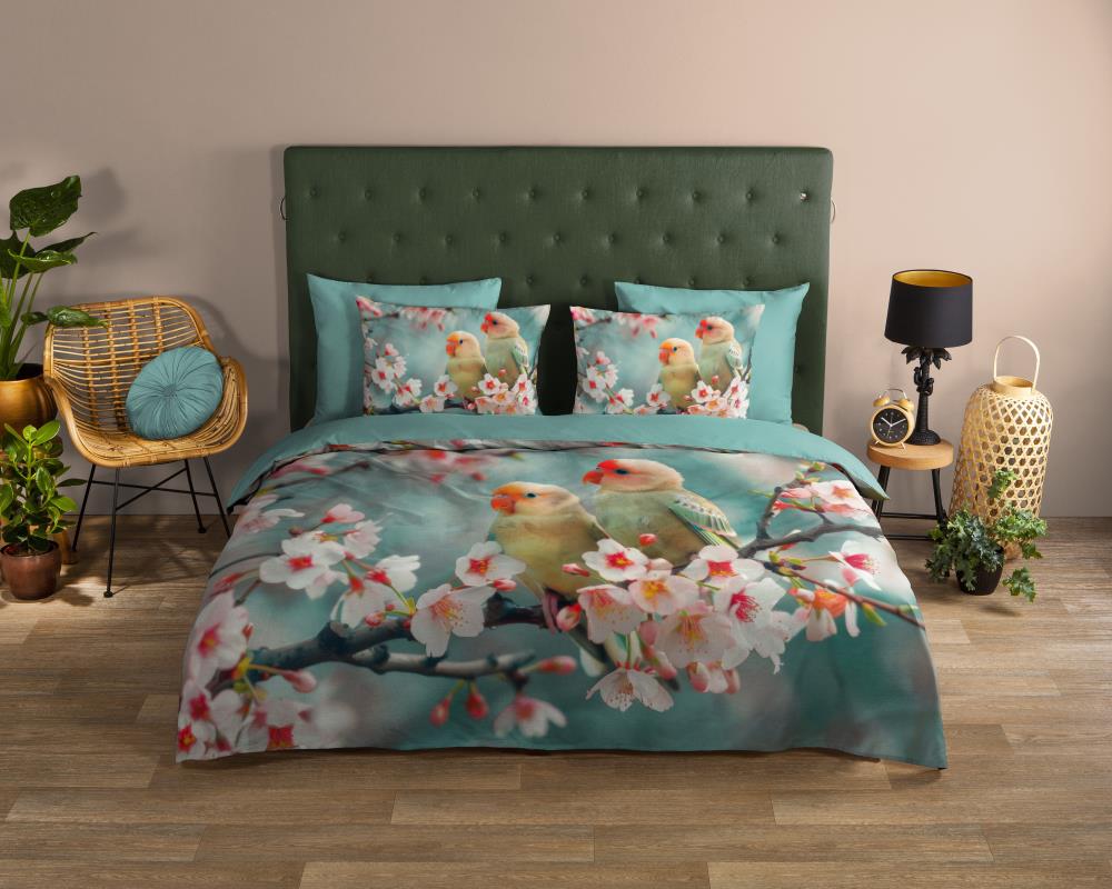 Dekbedovertrek Chibi van Good Morning met Vogeltjes op een bloesemtak, in de kleur aqua. Dit is gemaakt van 100% katoen. De kwaliteit is ademend, vochtabsorberend en voelt zacht en soepel aan. Dit mooie dekbedovertrek fleurt iedere slaapkamer op en is geschikt voor elk jaargetijde. Het katoenen dekbedovertrek is heerlijk koel in de zomer en geeft warmte in de winter.