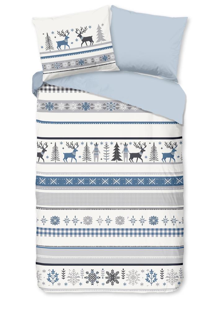 Flanellen dekbedovertrek Aila van Good Morning, in de kleur blauw, met een print van eenWinterse print. Het dekbedovertrek is gemaakt van 100% katoen/flanel dat is licht geruwd, waardoor een fluweelzacht laagje ontstaat dat heerlijk warm aanvoelt -perfect voor koude nachten.