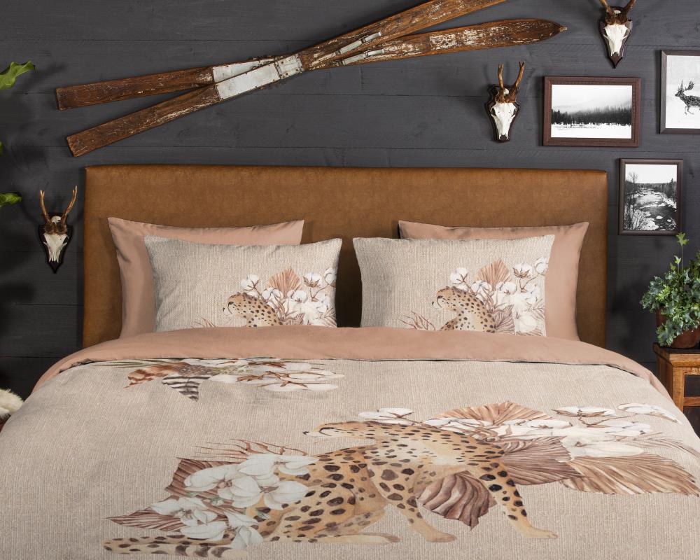 Flanellen dekbedovertrek Chevy van Good Morning, in de kleur zand, met een print van eentijger en bloemen. Het dekbedovertrek is gemaakt van 100% katoen/flanel dat is licht geruwd, waardoor een fluweelzacht laagje ontstaat dat heerlijk warm aanvoelt -perfect voor koude nachten.