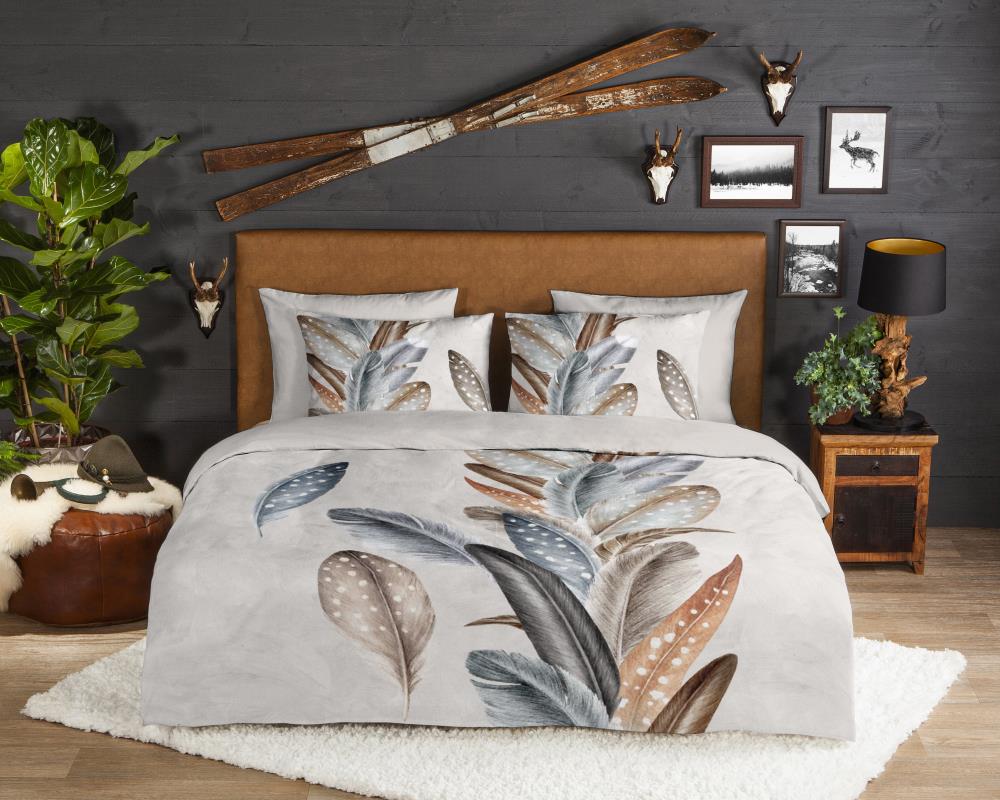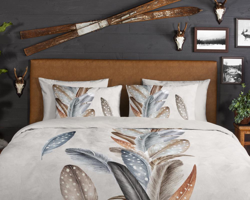 Flanellen dekbedovertrek Eina van Good Morning, in de kleur zand, met een print van eenveren. Het dekbedovertrek is gemaakt van 100% katoen/flanel dat is licht geruwd, waardoor een fluweelzacht laagje ontstaat dat heerlijk warm aanvoelt -perfect voor koude nachten.