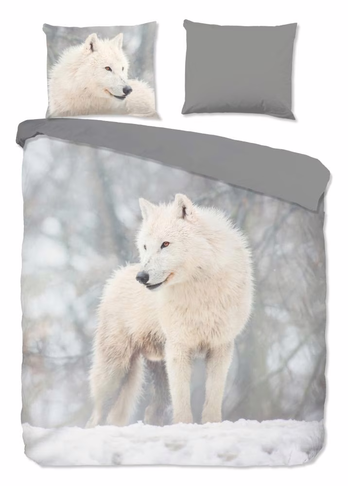 Flanellen dekbedovertrek Julian van Good Morning, in de kleur grijs, met een print van poolwolf in de sneeuw. Het dekbedovertrek is gemaakt van 100% katoen/flanel dat is licht geruwd, waardoor een fluweelzacht laagje ontstaat dat heerlijk warm aanvoelt -perfect voor koude nachten.