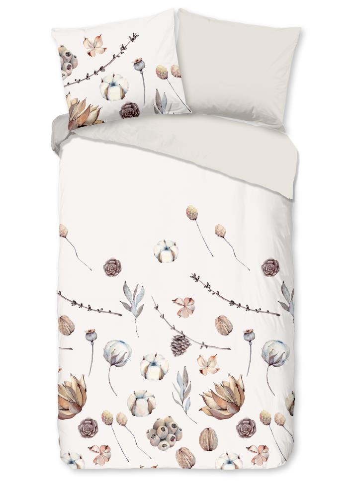 Flanellen dekbedovertrek Mirre van Good Morning, in de kleur zand, met een print van eendroog bloemen. Het dekbedovertrek is gemaakt van 100% katoen/flanel dat is licht geruwd, waardoor een fluweelzacht laagje ontstaat dat heerlijk warm aanvoelt -perfect voor koude nachten.
