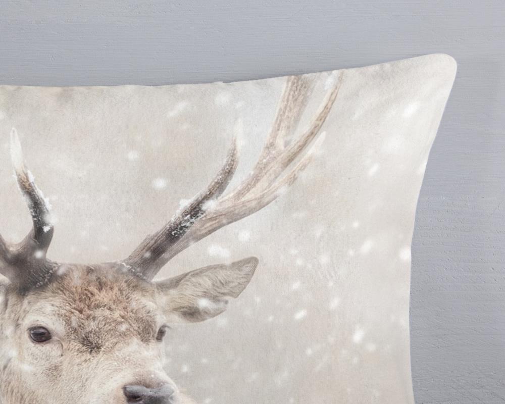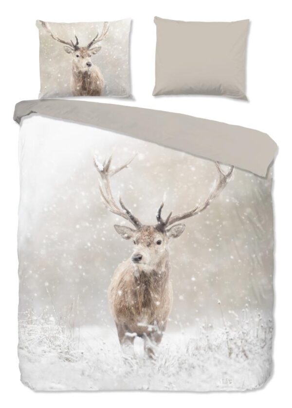Flanellen dekbedovertrek Snowydeer van Good Morning, in de kleur zand, met een print van eenherten in winterlandschap. Het dekbedovertrek is gemaakt van 100% katoen/flanel dat is licht geruwd, waardoor een fluweelzacht laagje ontstaat dat heerlijk warm aanvoelt -perfect voor koude nachten.