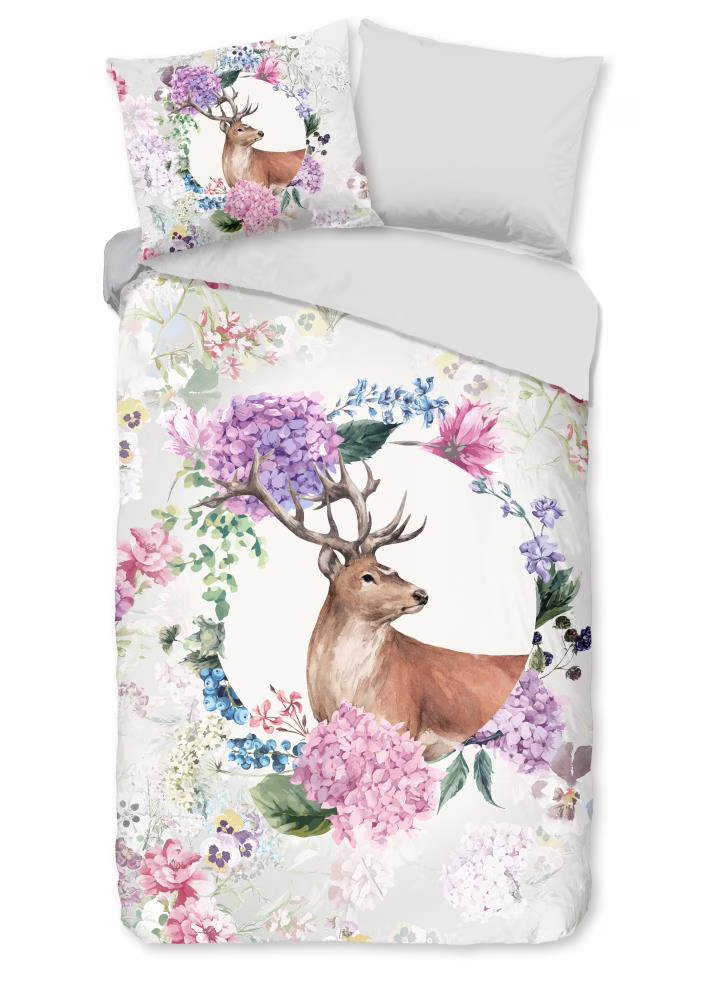 Flanellen dekbedovertrek Vedet van Good Morning, in de kleur grijs, met een print van eenHert. Het dekbedovertrek is gemaakt van 100% katoen/flanel dat is licht geruwd, waardoor een fluweelzacht laagje ontstaat dat heerlijk warm aanvoelt -perfect voor koude nachten.