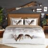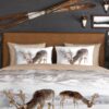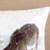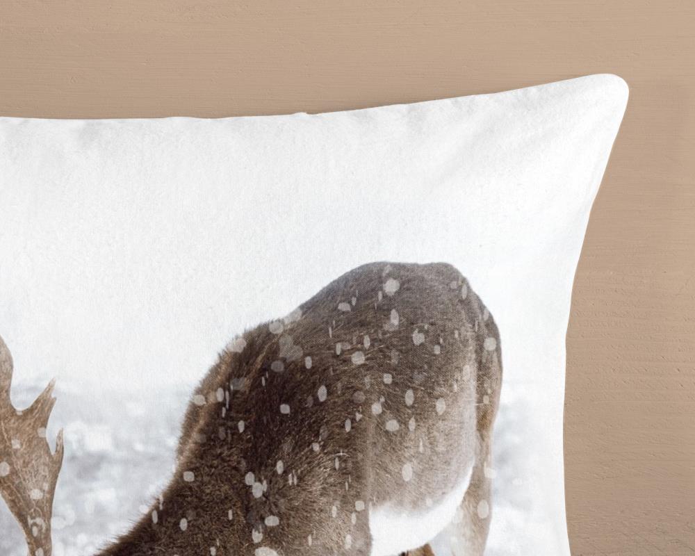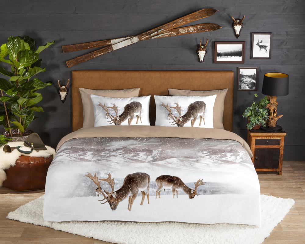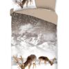 Flanellen dekbedovertrek Winter van Good Morning, in de kleur zand, met een print van eenherten in winterlandschap. Het dekbedovertrek is gemaakt van 100% katoen/flanel dat is licht geruwd, waardoor een fluweelzacht laagje ontstaat dat heerlijk warm aanvoelt -perfect voor koude nachten.