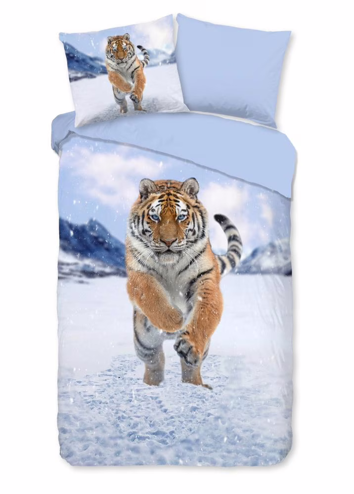 Flanellen dekbedovertrek Zelda van Good Morning, in de kleur multi, met een print van eentijger in de sneeuw. Het dekbedovertrek is gemaakt van 100% katoen/flanel dat is licht geruwd, waardoor een fluweelzacht laagje ontstaat dat heerlijk warm aanvoelt -perfect voor koude nachten.