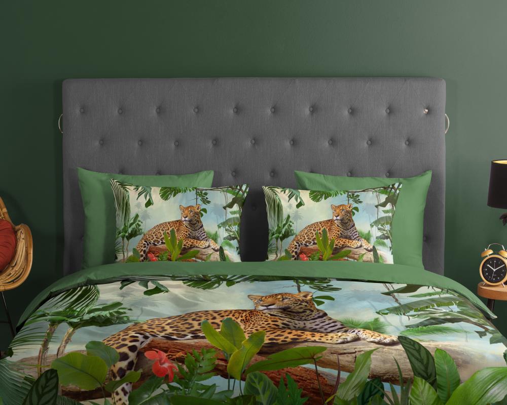 Dekbedovertrek Jungle van Good Morning met luipaard, in de kleur groen. Dit is gemaakt van 100% katoen. De kwaliteit is ademend, vochtabsorberend en voelt zacht en soepel aan. Dit mooie dekbedovertrek fleurt iedere slaapkamer op en is geschikt voor elk jaargetijde. Het katoenen dekbedovertrek is heerlijk koel in de zomer en geeft warmte in de winter.