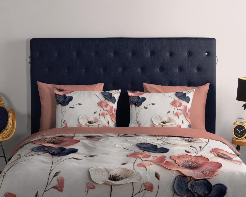 De voorzijde toont een luxe bloemenprint met grote, open bloemen in crème, warm rood, terracotta en diep donkerblauw. Fijne lijnen in de bloemblaadjes geven het dessin een bijna handgetekende uitstraling. Bovendien zorgen slanke takjes en subtiele bladaccenten voor extra diepte en beweging. De lichte beige achtergrond brengt rust, terwijl de bloemkleuren juist karakter toevoegen. Hierdoor ontstaat een harmonieus contrast dat de slaapkamer direct meer sfeer geeft. Dit maakt het een ideaal dekbedovertrek met bloemenprint voor volwassenen dat zowel opvallend als elegant is.Good Morning SAMOS sand met omkeerbare effen achterzijde