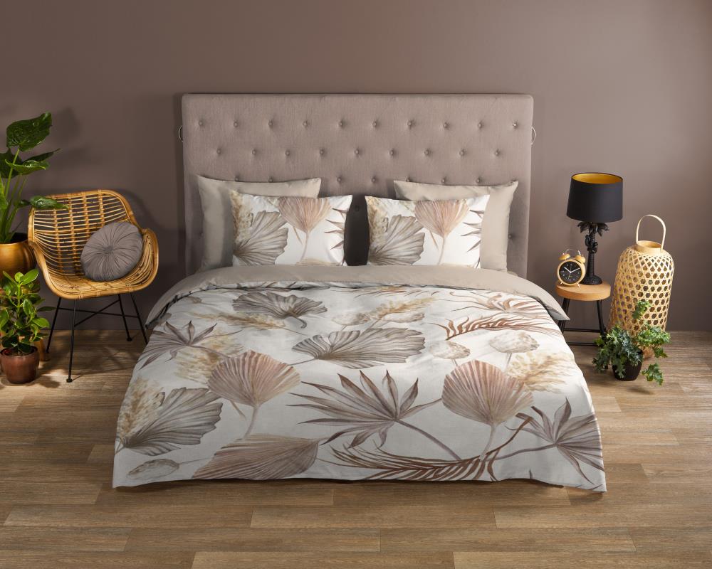 Dekbedovertrek Vince van Good Morning met bladeren, in de kleur zand. Dit is gemaakt van 100% katoen. De kwaliteit is ademend, vochtabsorberend en voelt zacht en soepel aan. Dit mooie dekbedovertrek fleurt iedere slaapkamer op en is geschikt voor elk jaargetijde. Het katoenen dekbedovertrek is heerlijk koel in de zomer en geeft warmte in de winter.