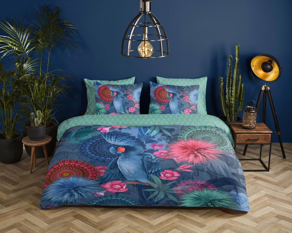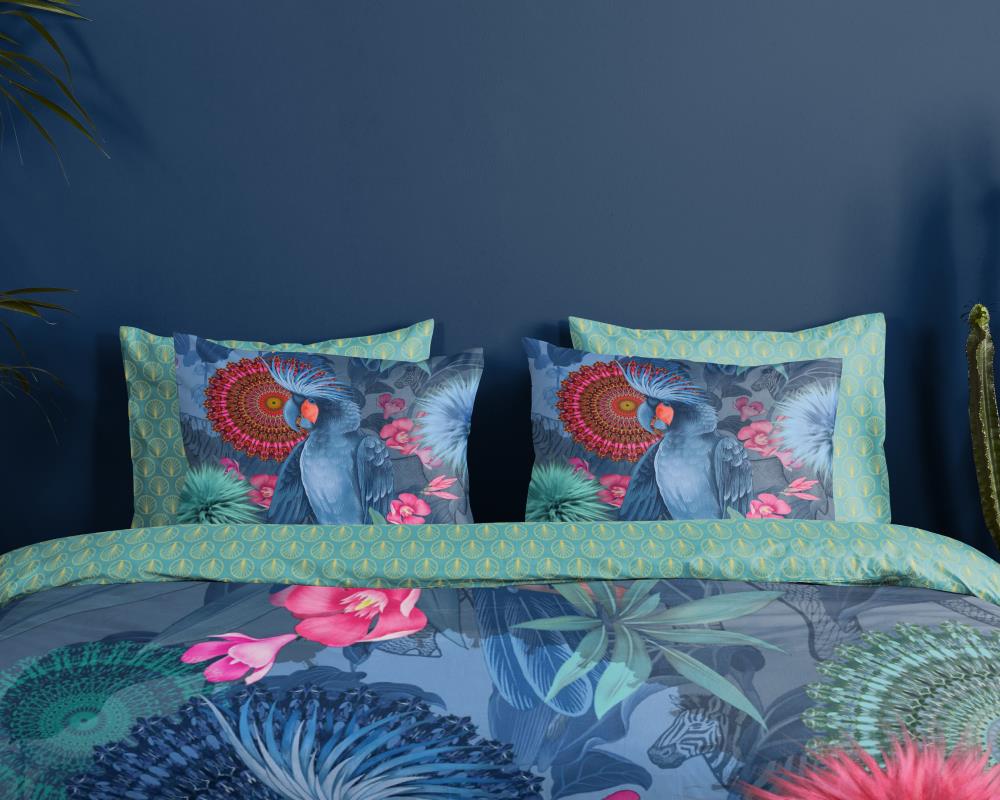 Satijnen dekbedovertrek ofelia van HIP. Dit luxe dekbedovertrek met mandalas, bloemen en een blauwe papegaai, in de kleur multi, is een dekbedovertrek dat opvalt. Een HIP dekbedovertrek is kleurrijk en uniek! Aan de achterkant van het dekbedovertrek zit altijd een leuke, bijpassende print. Een dekbedovertrek van HIP fleurt iedere slaapkamer op!