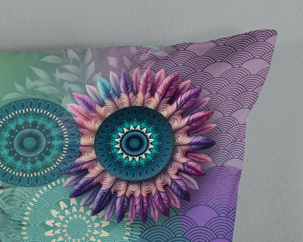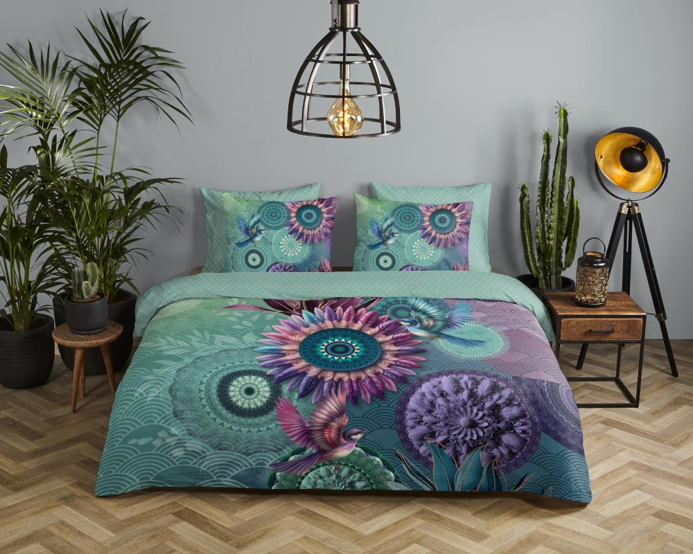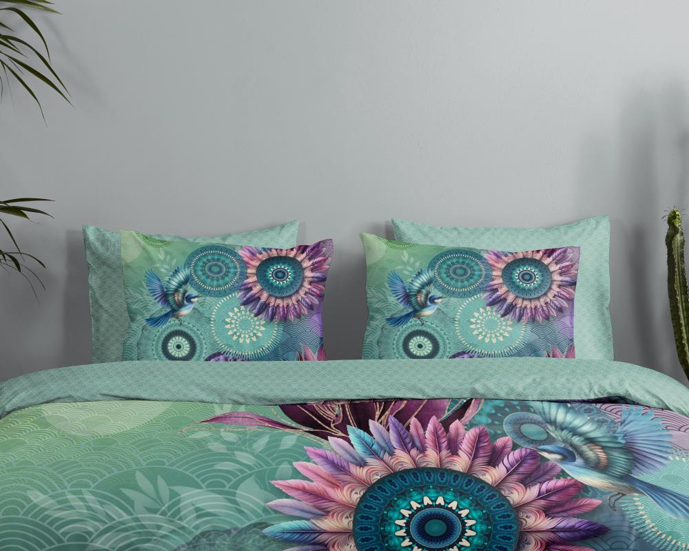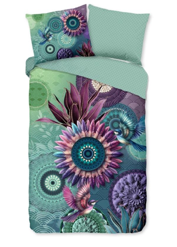 Satijnen dekbedovertrek Vespera van HIP. Dit luxe dekbedovertrek met madalas met planten en vogels, in de kleur mint, is een dekbedovertrek dat opvalt. Een HIP dekbedovertrek is kleurrijk en uniek! Aan de achterkant van het dekbedovertrek zit altijd een leuke, bijpassende print. Een dekbedovertrek van HIP fleurt iedere slaapkamer op!