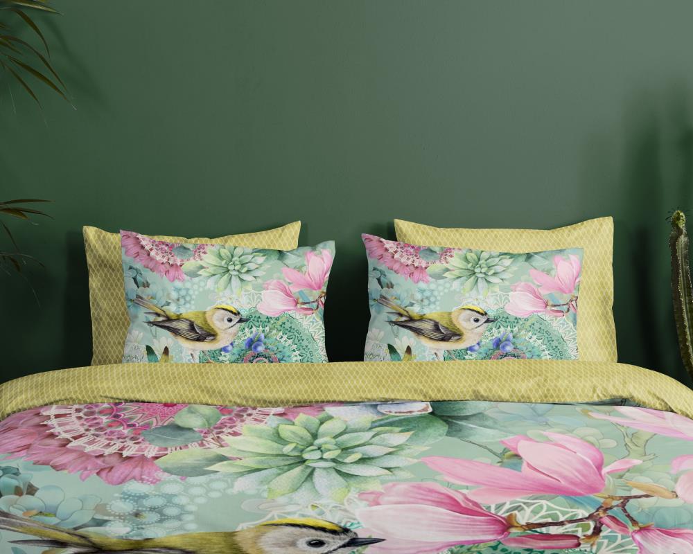 Satijnen dekbedovertrek xabine van HIP. Dit luxe dekbedovertrek met mandala's, bloemen en vogels, in de kleur groen, is een dekbedovertrek dat opvalt. Een HIP dekbedovertrek is kleurrijk en uniek! Aan de achterkant van het dekbedovertrek zit altijd een leuke, bijpassende print. Een dekbedovertrek van HIP fleurt iedere slaapkamer op!