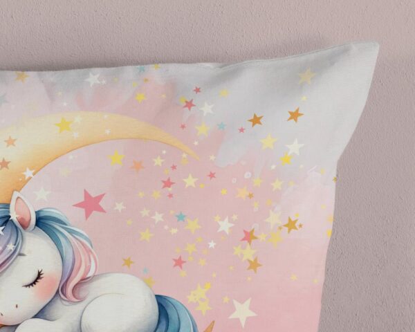 Het Good Morning Molly kinderdekbedovertrek eenhoorn valt direct op door het unieke ontwerp. Op het dekbedovertrek ligt een schattige eenhoorn rustig te slapen op een halve maan. Daaromheen zie je speelse sterren in verschillende kleuren, wat zorgt voor een magisch geheel. Daarnaast zijn de kleuren zorgvuldig afgestemd. Enerzijds zorgen zachte roze tinten voor warmte, terwijl anderzijds pastelkleuren zoals blauw en mint een frisse uitstraling geven. Hierdoor past dit kinder dekbed overtrek perfect in elke kinderkamer. Ook het kussensloop maakt deze bedset voor kinderen compleet. Eén zijde van het kussensloop toont de eenhoorn, terwijl de andere zijde is voorzien van een subtiel sterrenpatroon. Hierdoor ontstaat een speels én rustgevend geheel.100% katoen renforce: zacht, sterk en ademend