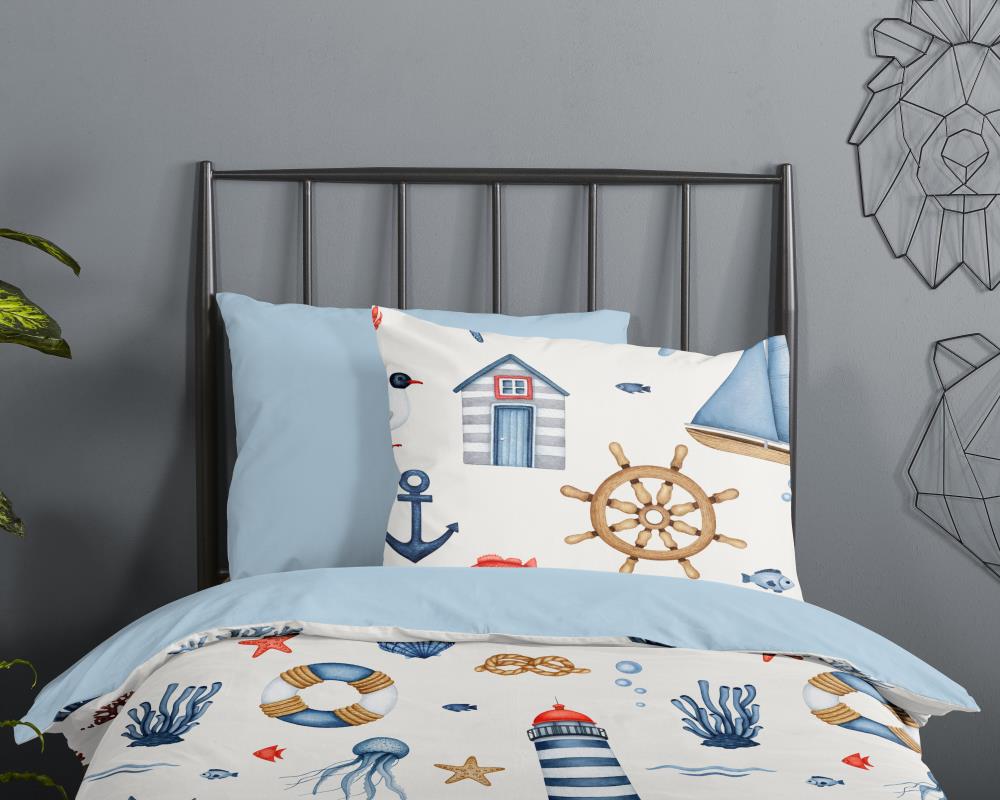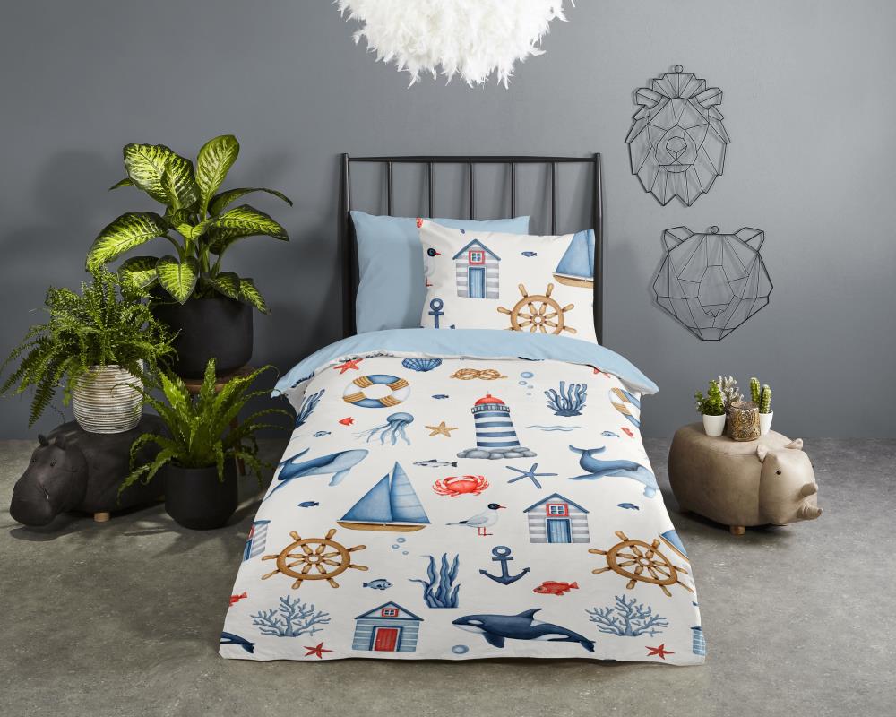 Kinderdekbedovertrek Ahoy van Good Morning in de kleur blauw, met een print van maritiem. Het dekbedovertrek is gemaakt van 100% katoen. Deze kwaliteit is ademend, vochtabsorberend en voelt zacht en soepel aan. Dit leuke kinderdekbedovertrek is een leuke toevoeging aan iedere kinderkamer. Het kinderdekbedovertrek is geschikt voor ieder jaargetijde. Het katoenen 100% katoen is heerlijk koel in de zomer en geeft warmte in de winter.