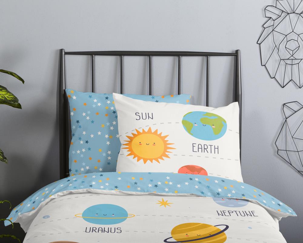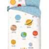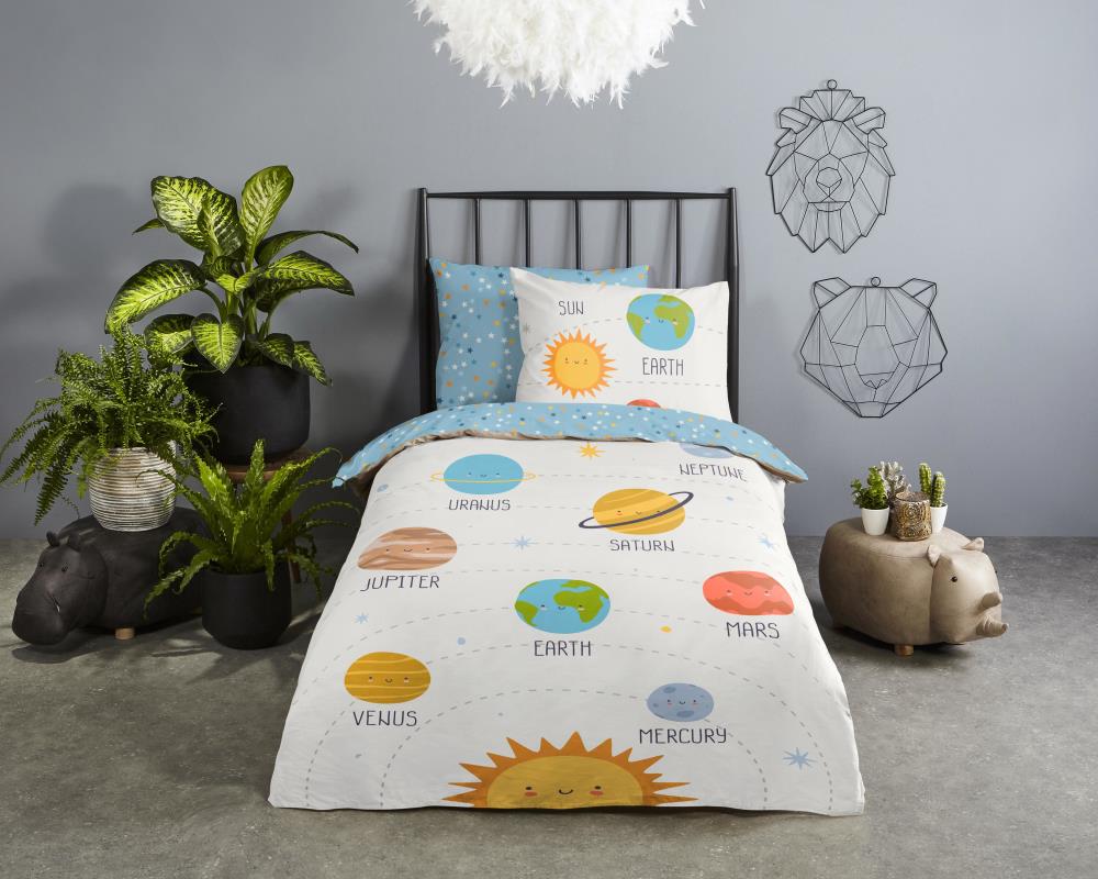 Kinderdekbedovertrek Astra van Good Morning in de kleur wit, met een print van ruimte / planeten. Het dekbedovertrek is gemaakt van 100% katoen. Deze kwaliteit is ademend, vochtabsorberend en voelt zacht en soepel aan. Dit leuke kinderdekbedovertrek is een leuke toevoeging aan iedere kinderkamer. Het kinderdekbedovertrek is geschikt voor ieder jaargetijde. Het katoenen 100% katoen is heerlijk koel in de zomer en geeft warmte in de winter.