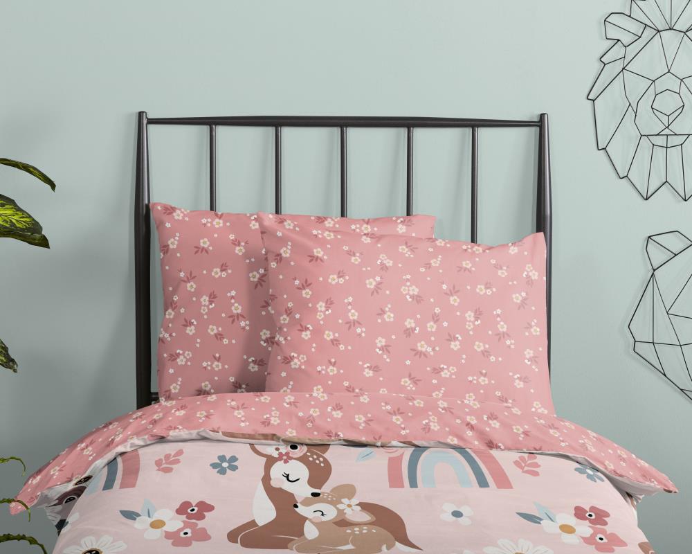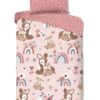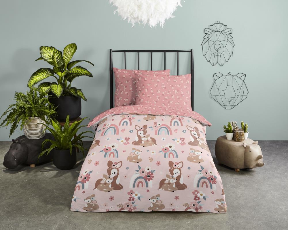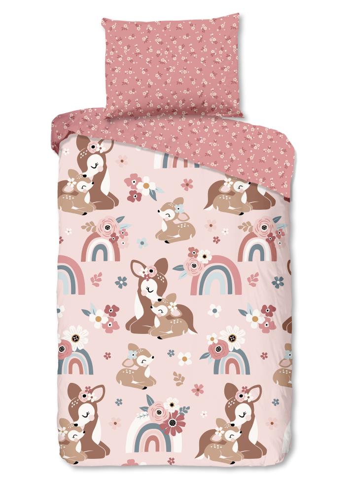 Kinderdekbedovertrek Bibi van Good Morning in de kleur roze, met een print van bambi hert met regenboog. Het dekbedovertrek is gemaakt van 100% katoen. Deze kwaliteit is ademend, vochtabsorberend en voelt zacht en soepel aan. Dit leuke kinderdekbedovertrek is een leuke toevoeging aan iedere kinderkamer. Het kinderdekbedovertrek is geschikt voor ieder jaargetijde. Het katoenen 100% katoen is heerlijk koel in de zomer en geeft warmte in de winter.