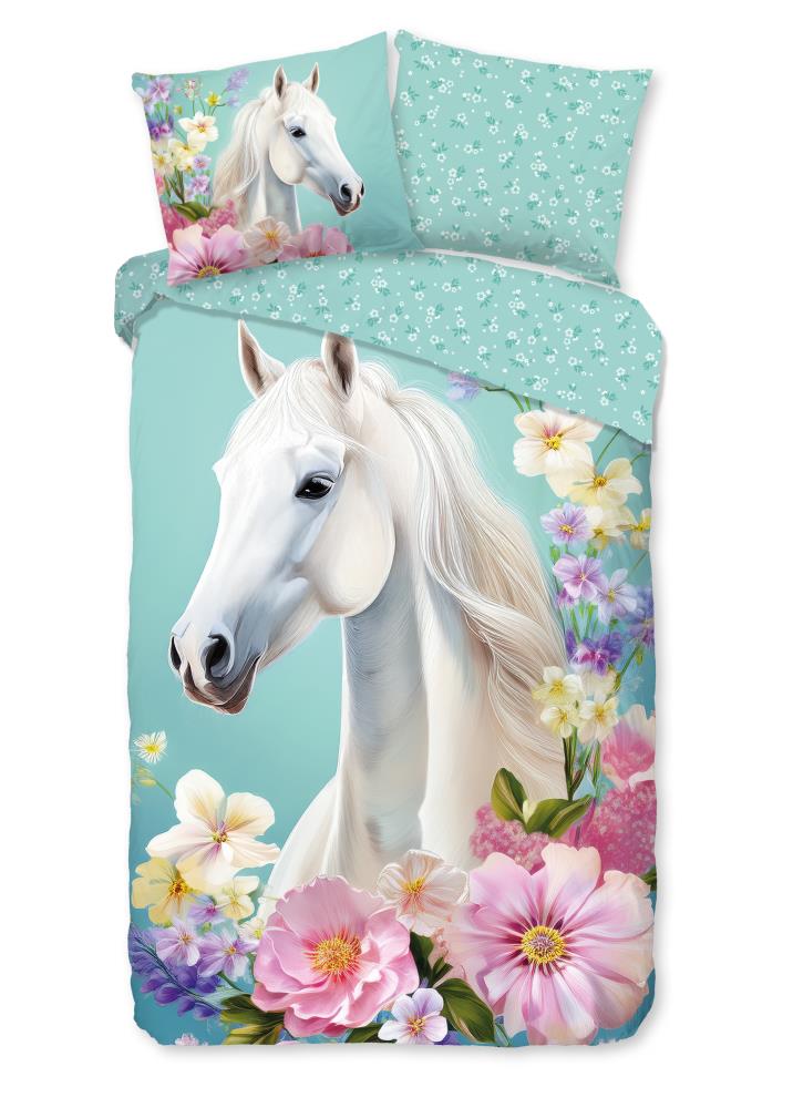 Kinderdekbedovertrek Binky van Good Morning in de kleur mint, met een print van paard met bloemen. Het dekbedovertrek is gemaakt van 100% katoen. Deze kwaliteit is ademend, vochtabsorberend en voelt zacht en soepel aan. Dit leuke kinderdekbedovertrek is een leuke toevoeging aan iedere kinderkamer. Het kinderdekbedovertrek is geschikt voor ieder jaargetijde. Het katoenen 100% katoen is heerlijk koel in de zomer en geeft warmte in de winter.