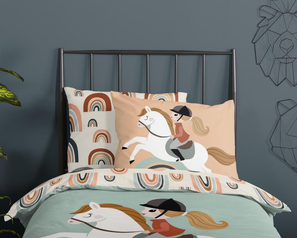 Kinderdekbedovertrek Destin van Good Morning in de kleur multi, met een print van paard en regenboog. Het dekbedovertrek is gemaakt van 100% katoen. Deze kwaliteit is ademend, vochtabsorberend en voelt zacht en soepel aan. Dit leuke kinderdekbedovertrek is een leuke toevoeging aan iedere kinderkamer. Het kinderdekbedovertrek is geschikt voor ieder jaargetijde. Het katoenen 100% katoen is heerlijk koel in de zomer en geeft warmte in de winter.