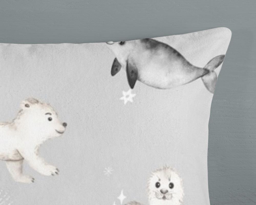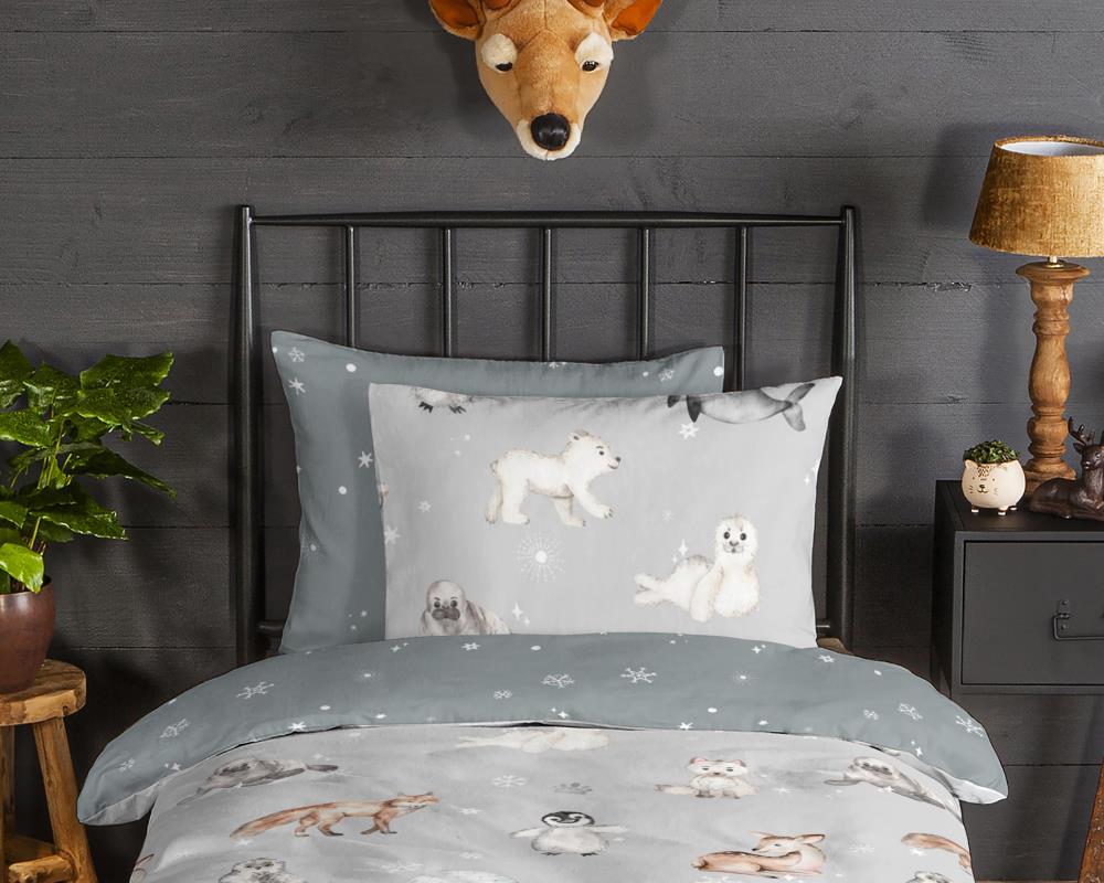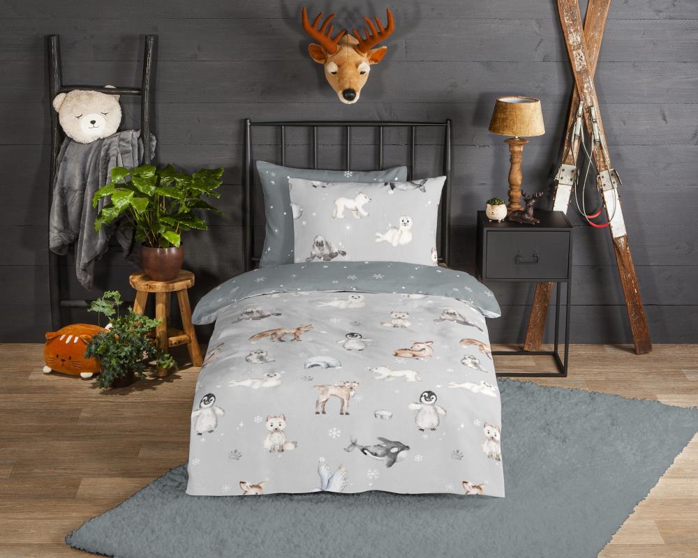 Flanellen kinderdekbedovertrek Cira van Good Morning, in de kleur grijs, met een print van een dieren in winterthema. Het dekbedovertrek is gemaakt van 100% katoen/flanel dat licht is geruwd, waardoor een fluweeelzacht laagje ontstaat dat heerlijk warm aanvoelt -perfect voor koude nachten. Deze warme, comfortabele stof is ademend en vochtabsorberend. Dit leuke kinderdekbedovertrek is een toevoeging aan iedere kinderkamer. Flanellen kinderdekbedovertrek zijn bij uitstek geschikt voor de koude wintermaanden.