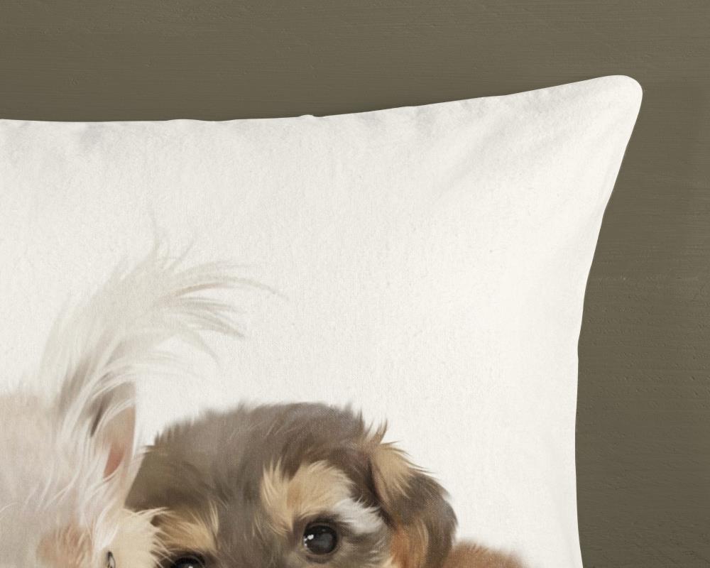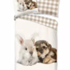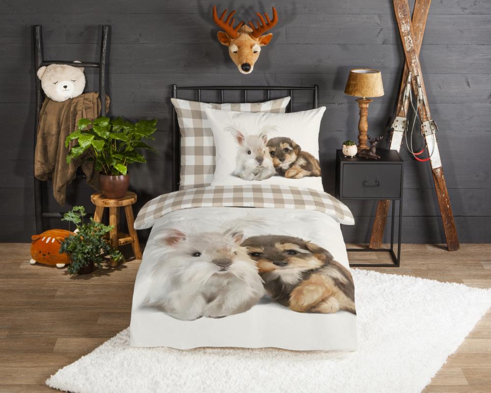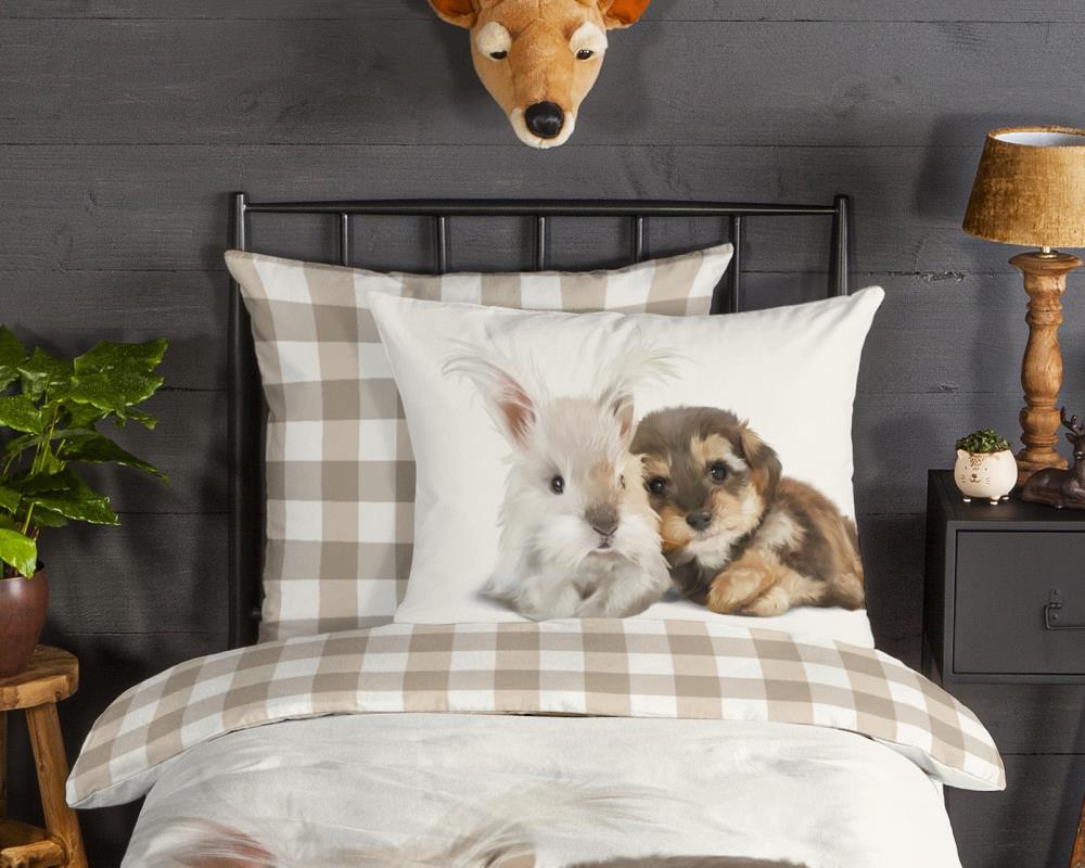 Flanellen kinderdekbedovertrek Cute van Good Morning, in de kleur zand, met een print van een hond en konijn. Het dekbedovertrek is gemaakt van 100% katoen/flanel dat licht is geruwd, waardoor een fluweeelzacht laagje ontstaat dat heerlijk warm aanvoelt -perfect voor koude nachten. Deze warme, comfortabele stof is ademend en vochtabsorberend. Dit leuke kinderdekbedovertrek is een toevoeging aan iedere kinderkamer. Flanellen kinderdekbedovertrek zijn bij uitstek geschikt voor de koude wintermaanden.