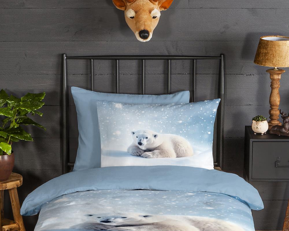 Flanellen kinderdekbedovertrek Esben van Good Morning, in de kleur blauw, met een print van een ijsbeer. Het dekbedovertrek is gemaakt van 100% katoen/flanel dat licht is geruwd, waardoor een fluweeelzacht laagje ontstaat dat heerlijk warm aanvoelt -perfect voor koude nachten. Deze warme, comfortabele stof is ademend en vochtabsorberend. Dit leuke kinderdekbedovertrek is een toevoeging aan iedere kinderkamer. Flanellen kinderdekbedovertrek zijn bij uitstek geschikt voor de koude wintermaanden.