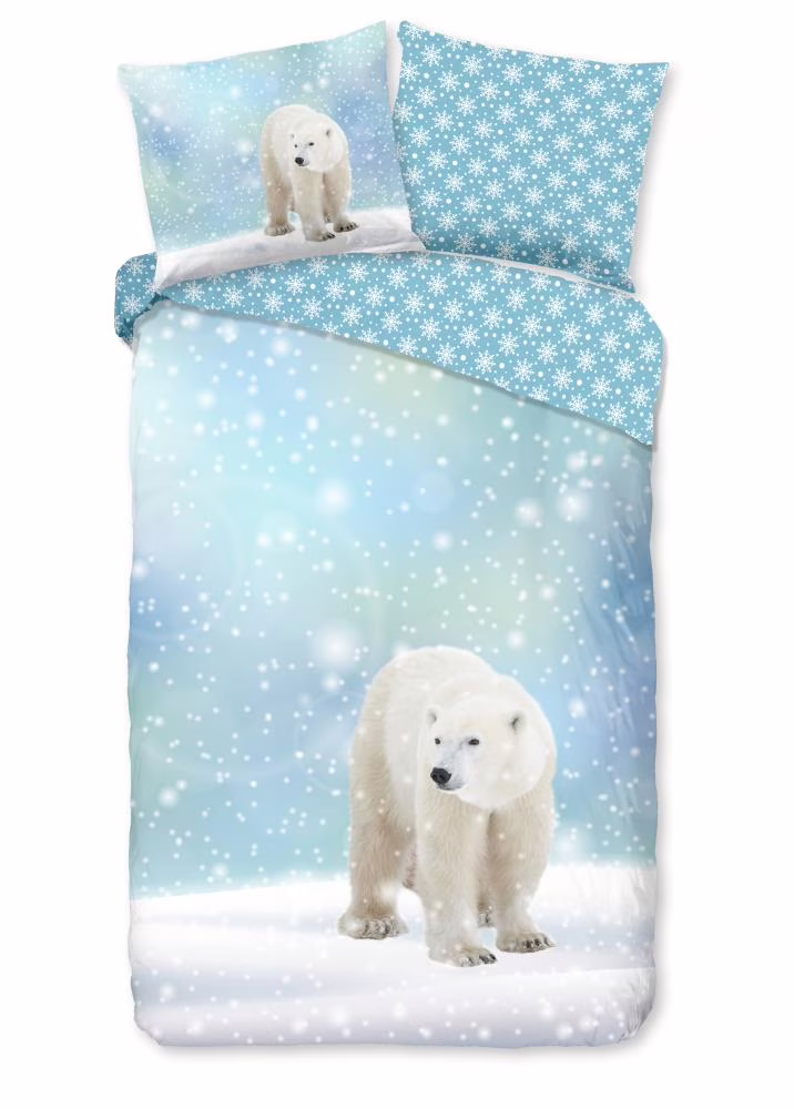 Flanellen kinderdekbedovertrek Icebear van Good Morning, in de kleur blauw, met een print van een ijsbeer in de sneeuw. Het dekbedovertrek is gemaakt van 100% katoen/flanel dat licht is geruwd, waardoor een fluweeelzacht laagje ontstaat dat heerlijk warm aanvoelt -perfect voor koude nachten. Deze warme, comfortabele stof is ademend en vochtabsorberend. Dit leuke kinderdekbedovertrek is een toevoeging aan iedere kinderkamer. Flanellen kinderdekbedovertrek zijn bij uitstek geschikt voor de koude wintermaanden.