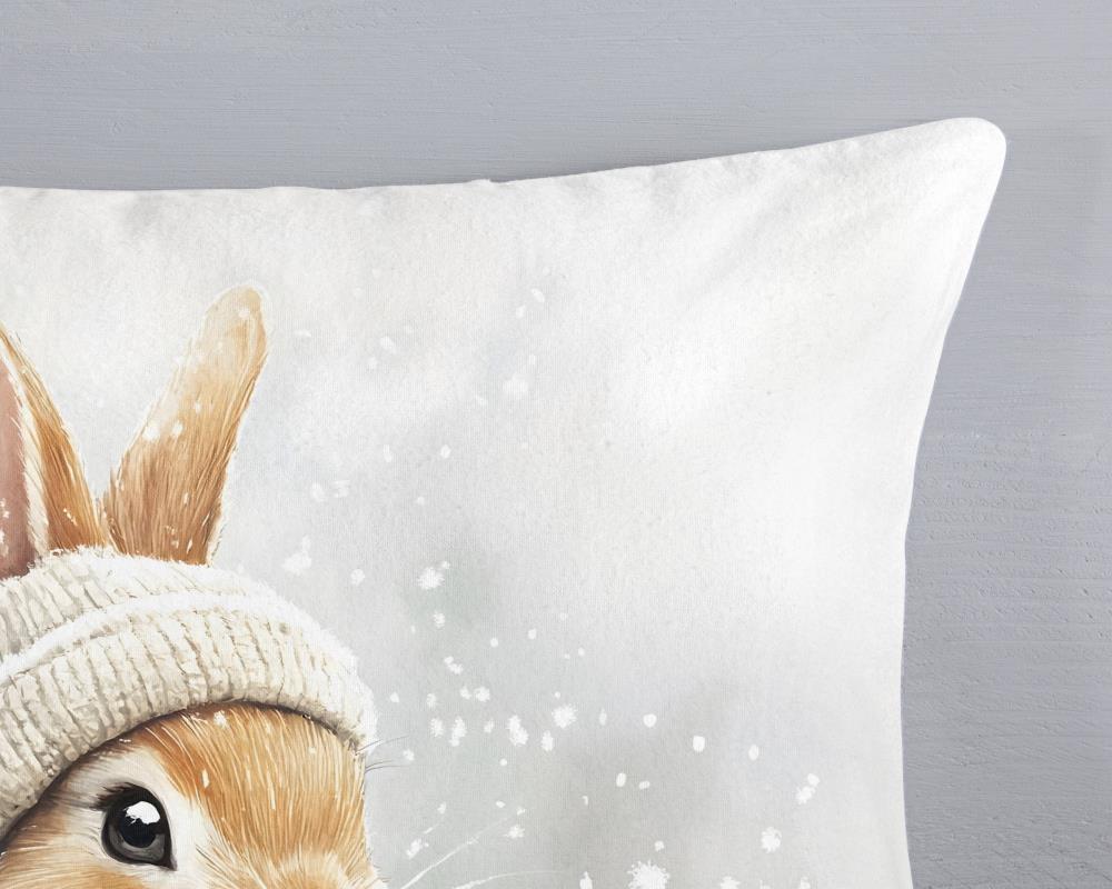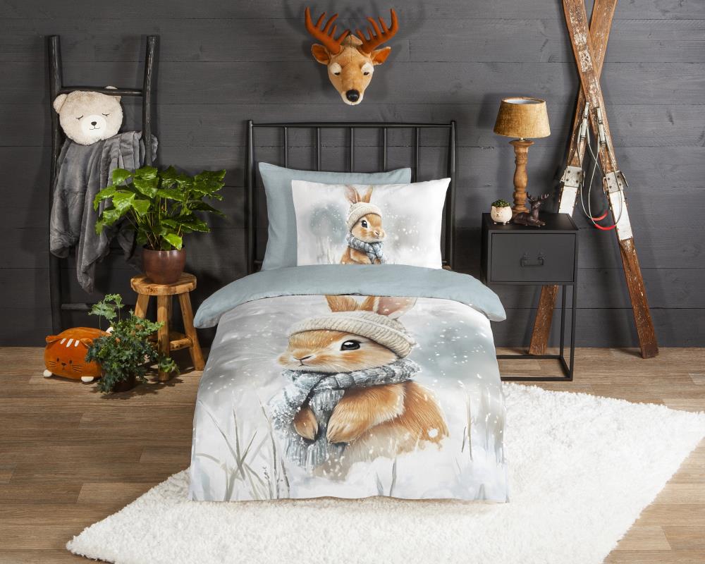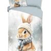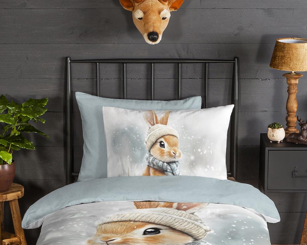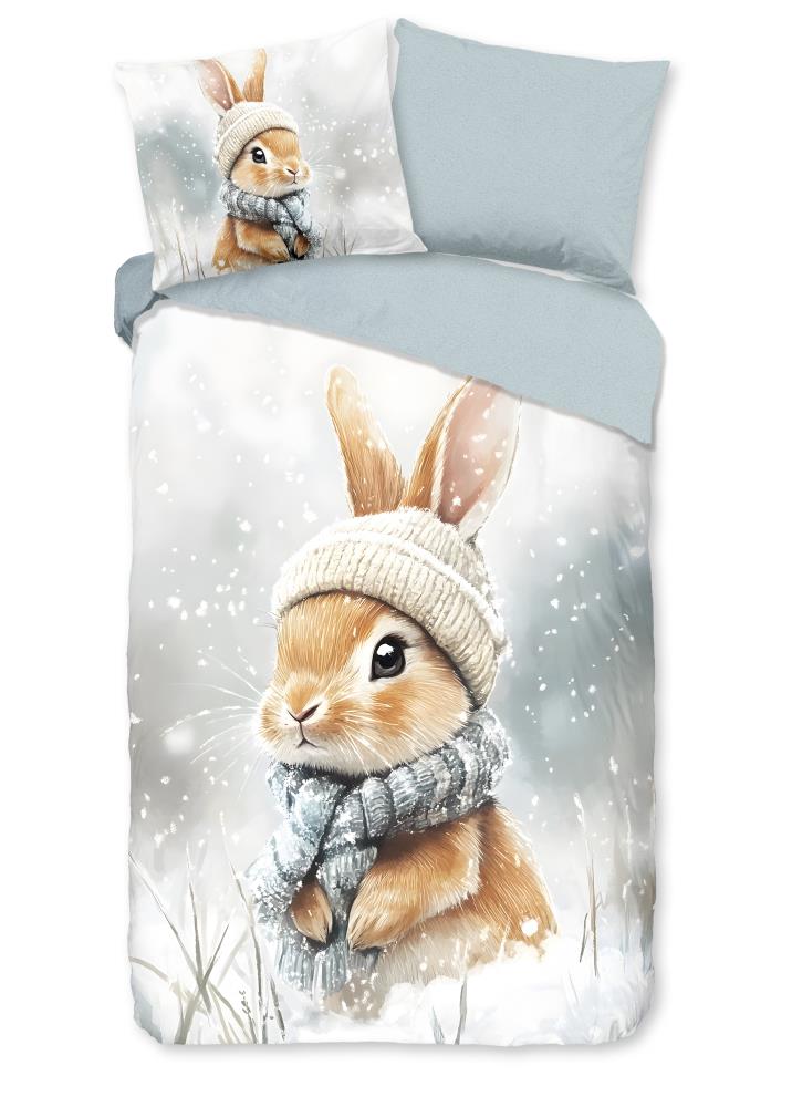 Flanellen kinderdekbedovertrek Idun van Good Morning, in de kleur grijs, met een print van een Konijn met gebreide muts en sjaal. Het dekbedovertrek is gemaakt van 100% katoen/flanel dat licht is geruwd, waardoor een fluweeelzacht laagje ontstaat dat heerlijk warm aanvoelt -perfect voor koude nachten. Deze warme, comfortabele stof is ademend en vochtabsorberend. Dit leuke kinderdekbedovertrek is een toevoeging aan iedere kinderkamer. Flanellen kinderdekbedovertrek zijn bij uitstek geschikt voor de koude wintermaanden.