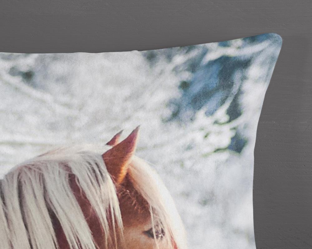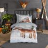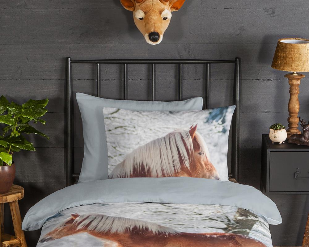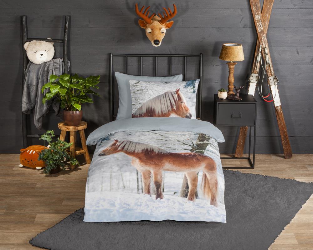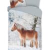 Flanellen kinderdekbedovertrek Scarlet van Good Morning, in de kleur multi, met een print van een haflinger paard in de sneeuw. Het dekbedovertrek is gemaakt van 100% katoen/flanel dat licht is geruwd, waardoor een fluweeelzacht laagje ontstaat dat heerlijk warm aanvoelt -perfect voor koude nachten. Deze warme, comfortabele stof is ademend en vochtabsorberend. Dit leuke kinderdekbedovertrek is een toevoeging aan iedere kinderkamer. Flanellen kinderdekbedovertrek zijn bij uitstek geschikt voor de koude wintermaanden.