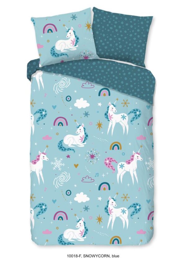 Flanellen kinderdekbedovertrek Snowycorn van Good Morning, in de kleur blauw, met een print van een eenhoorns en regenbogen. Het dekbedovertrek is gemaakt van 100% katoen/flanel dat licht is geruwd, waardoor een fluweeelzacht laagje ontstaat dat heerlijk warm aanvoelt -perfect voor koude nachten. Deze warme, comfortabele stof is ademend en vochtabsorberend. Dit leuke kinderdekbedovertrek is een toevoeging aan iedere kinderkamer. Flanellen kinderdekbedovertrek zijn bij uitstek geschikt voor de koude wintermaanden.