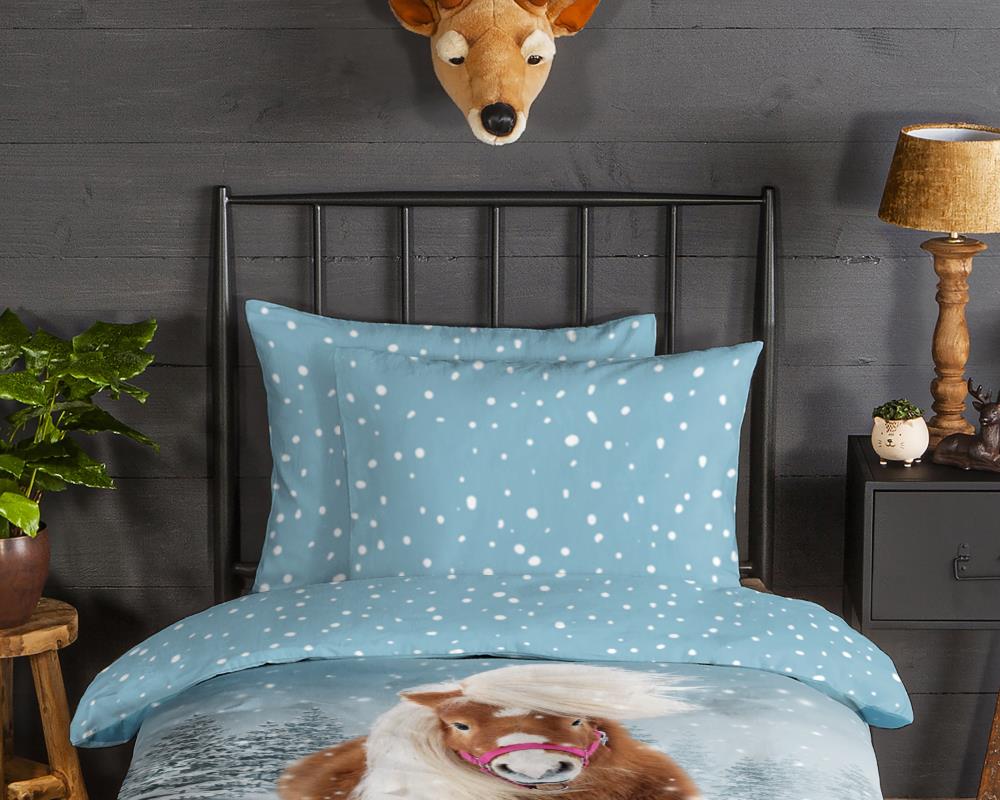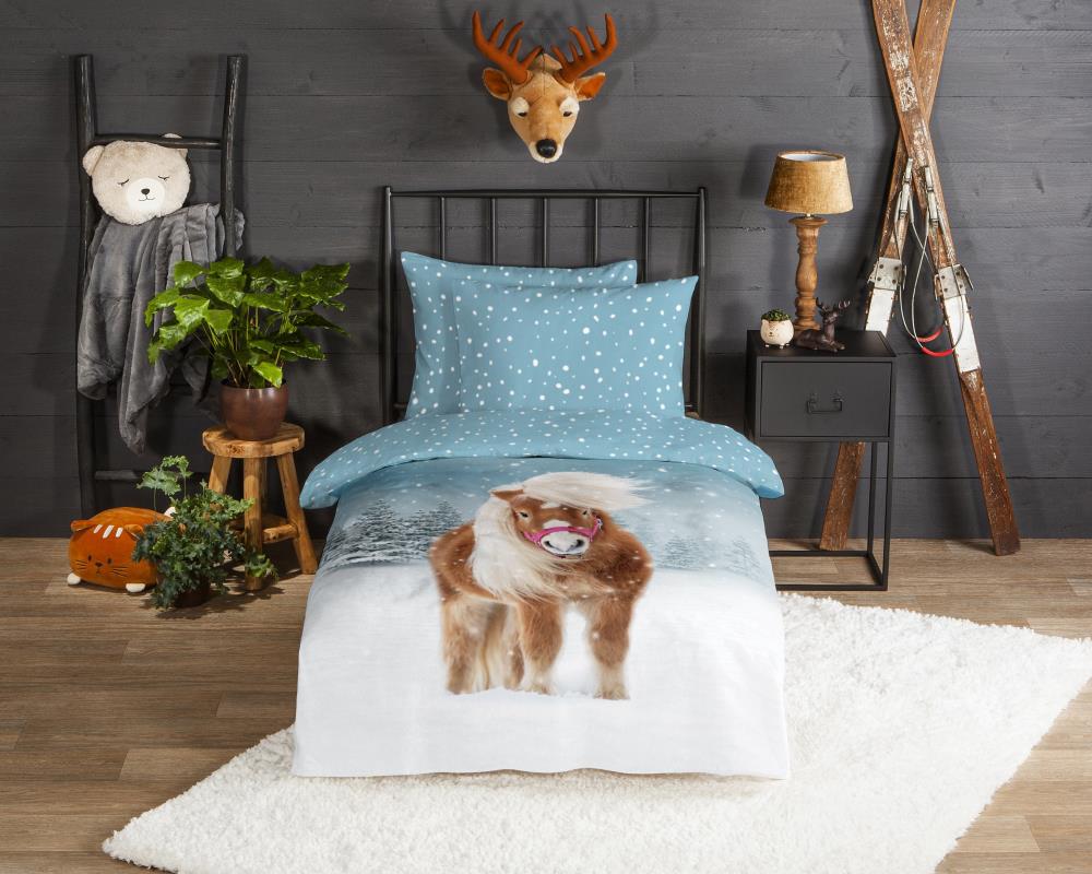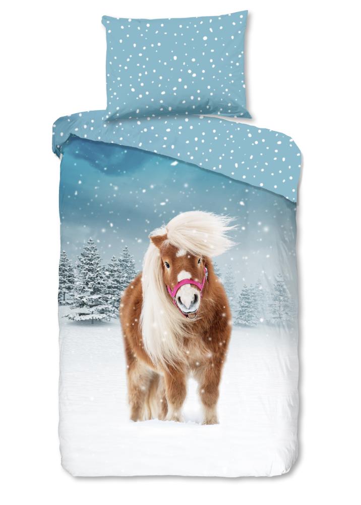 Flanellen kinderdekbedovertrek Sweet van Good Morning, in de kleur multi, met een print van een paard in de sneeuw. Het dekbedovertrek is gemaakt van 100% katoen/flanel dat licht is geruwd, waardoor een fluweeelzacht laagje ontstaat dat heerlijk warm aanvoelt -perfect voor koude nachten. Deze warme, comfortabele stof is ademend en vochtabsorberend. Dit leuke kinderdekbedovertrek is een toevoeging aan iedere kinderkamer. Flanellen kinderdekbedovertrek zijn bij uitstek geschikt voor de koude wintermaanden.