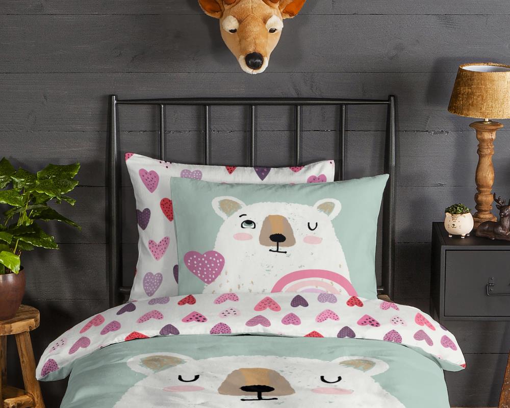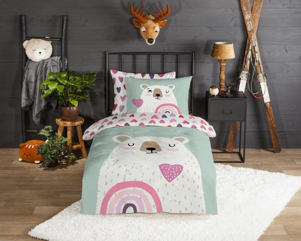 Flanellen kinderdekbedovertrek Ted van Good Morning, in de kleur multi, met een print van een beer met hart en regenboog. Het dekbedovertrek is gemaakt van 100% katoen/flanel dat licht is geruwd, waardoor een fluweeelzacht laagje ontstaat dat heerlijk warm aanvoelt -perfect voor koude nachten. Deze warme, comfortabele stof is ademend en vochtabsorberend. Dit leuke kinderdekbedovertrek is een toevoeging aan iedere kinderkamer. Flanellen kinderdekbedovertrek zijn bij uitstek geschikt voor de koude wintermaanden.