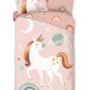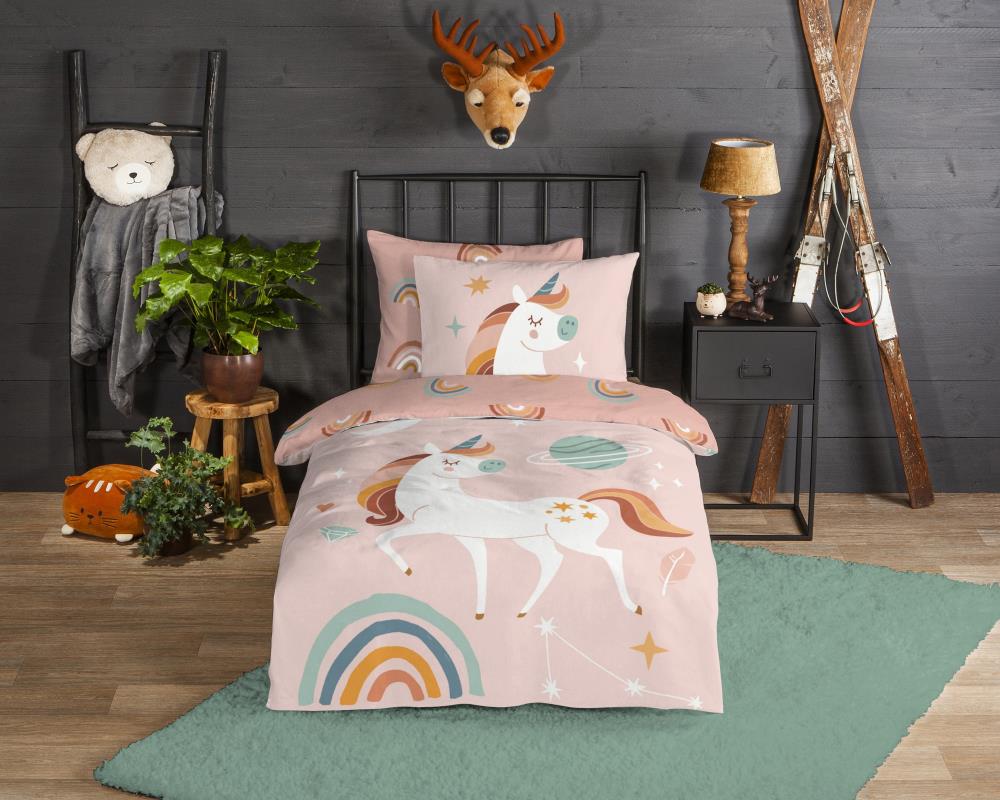 Flanellen kinderdekbedovertrek Unidance van Good Morning, in de kleur roze, met een print van een eenhoorn, planeten en regenboog. Het dekbedovertrek is gemaakt van 100% katoen/flanel dat licht is geruwd, waardoor een fluweeelzacht laagje ontstaat dat heerlijk warm aanvoelt -perfect voor koude nachten. Deze warme, comfortabele stof is ademend en vochtabsorberend. Dit leuke kinderdekbedovertrek is een toevoeging aan iedere kinderkamer. Flanellen kinderdekbedovertrek zijn bij uitstek geschikt voor de koude wintermaanden.
