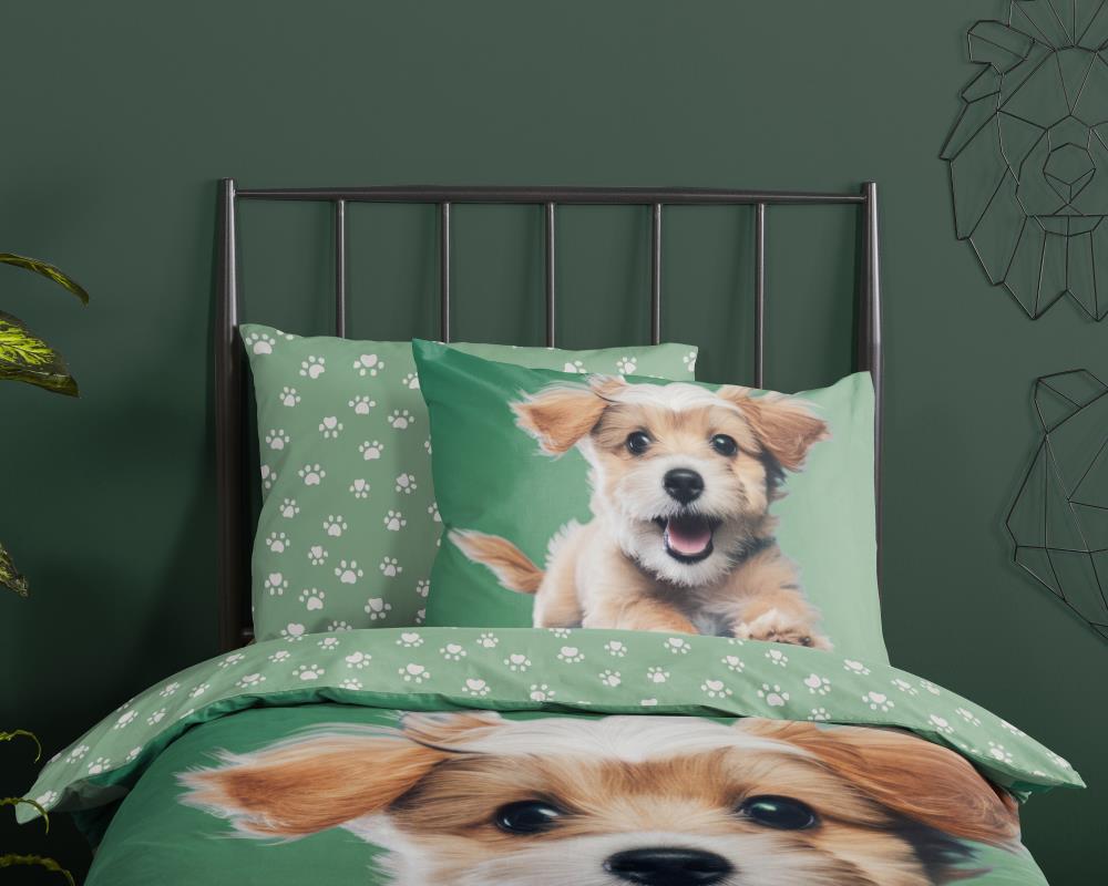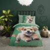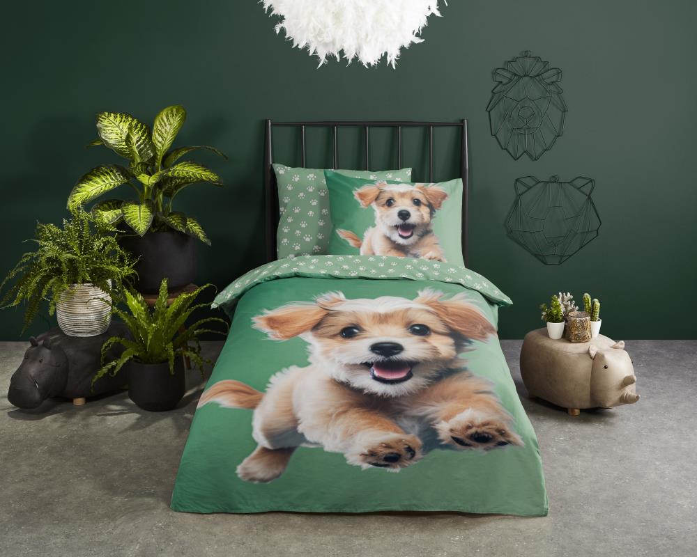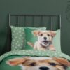 Kinderdekbedovertrek Mambo van Good Morning in de kleur groen, met een print van hondje. Het dekbedovertrek is gemaakt van 100% katoen. Deze kwaliteit is ademend, vochtabsorberend en voelt zacht en soepel aan. Dit leuke kinderdekbedovertrek is een leuke toevoeging aan iedere kinderkamer. Het kinderdekbedovertrek is geschikt voor ieder jaargetijde. Het katoenen 100% katoen is heerlijk koel in de zomer en geeft warmte in de winter.