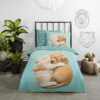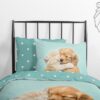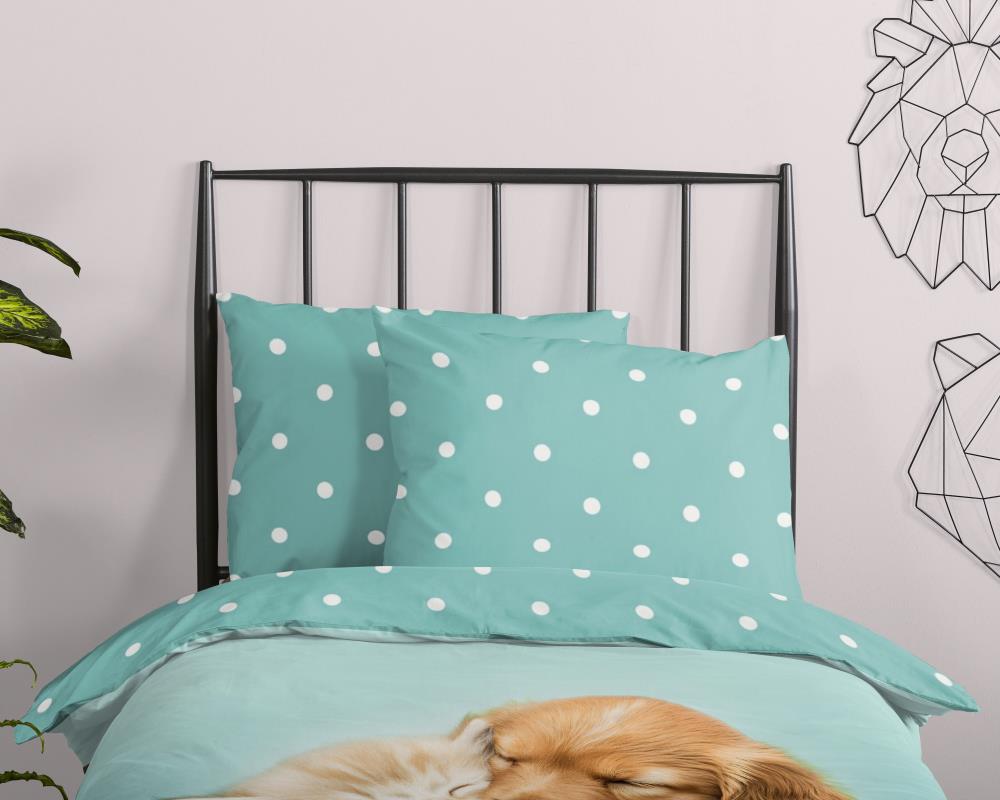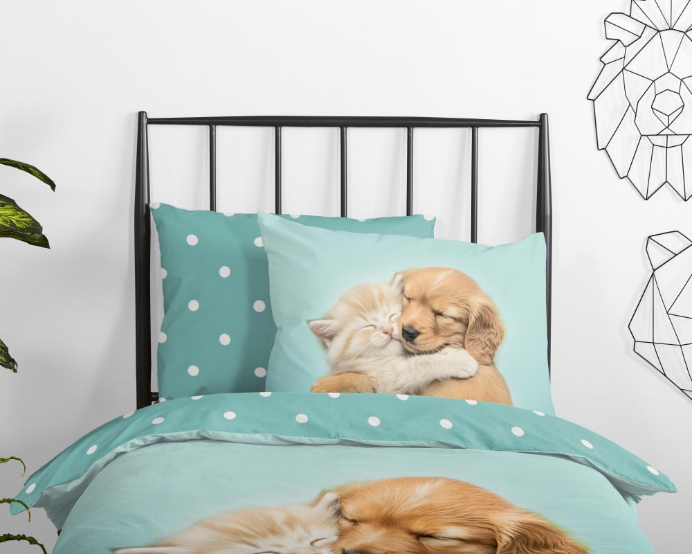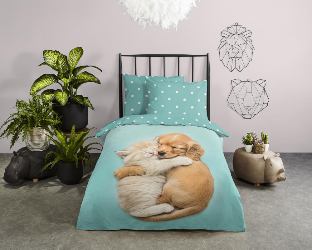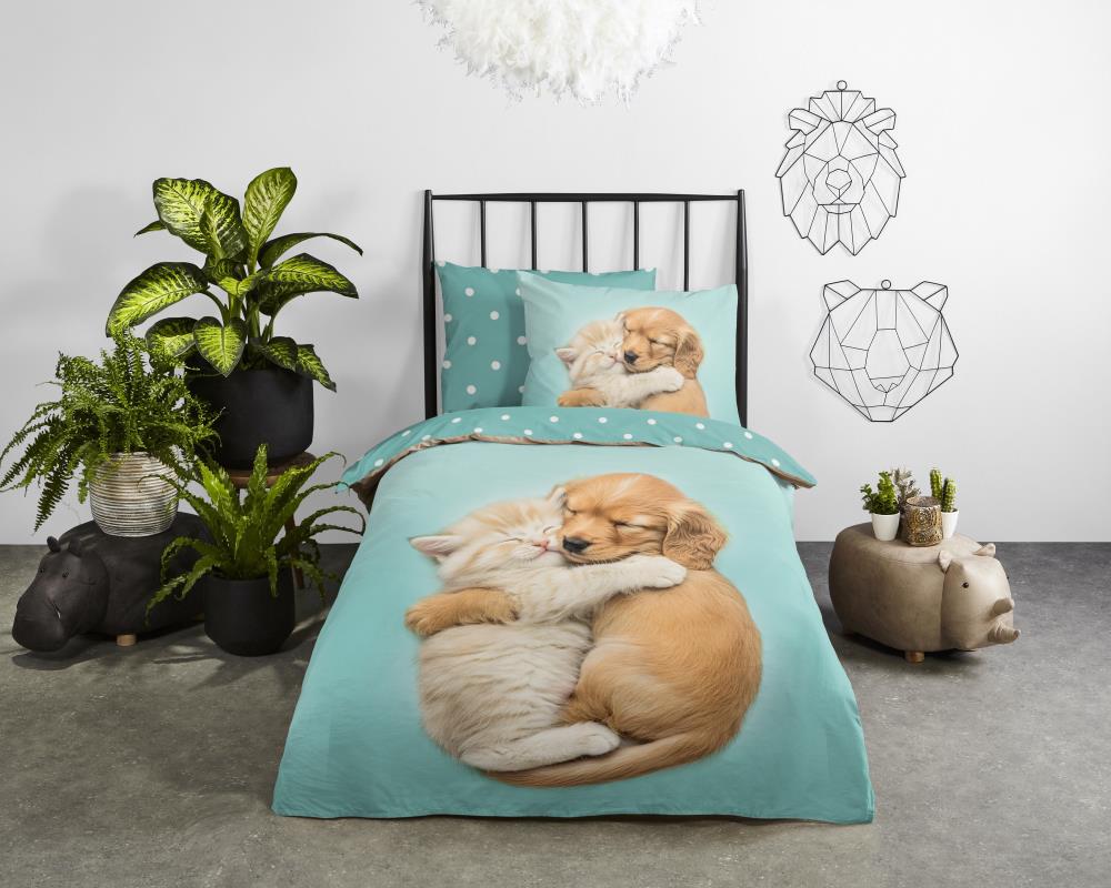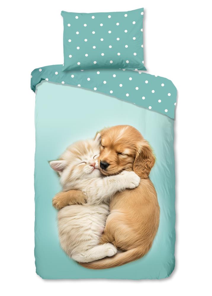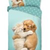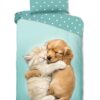 Kinderdekbedovertrek Paxy van Good Morning in de kleur aqua, met een print van hond en poes. Het dekbedovertrek is gemaakt van 100% katoen. Deze kwaliteit is ademend, vochtabsorberend en voelt zacht en soepel aan. Dit leuke kinderdekbedovertrek is een leuke toevoeging aan iedere kinderkamer. Het kinderdekbedovertrek is geschikt voor ieder jaargetijde. Het katoenen 100% katoen is heerlijk koel in de zomer en geeft warmte in de winter.