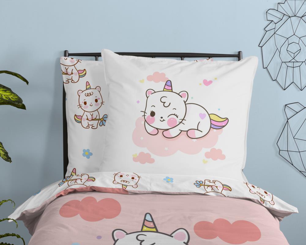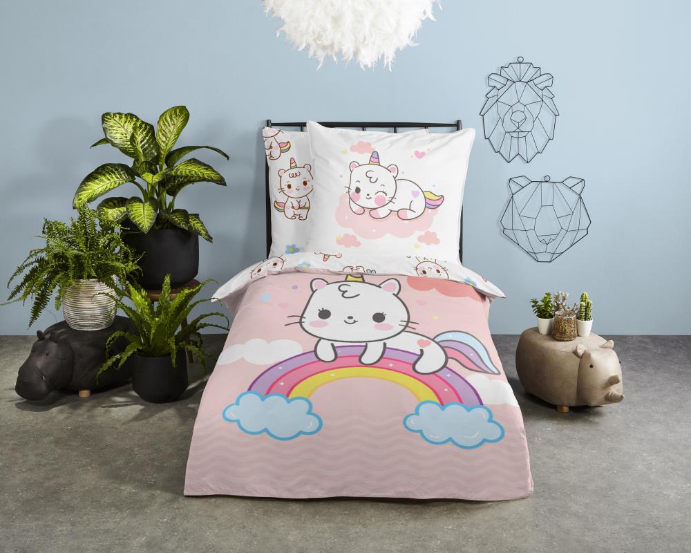 Kinderdekbedovertrek Puk van Good Morning in de kleur roze, met een print van eenhoorn kat met regenboog. Het dekbedovertrek is gemaakt van 100% katoen. Deze kwaliteit is ademend, vochtabsorberend en voelt zacht en soepel aan. Dit leuke kinderdekbedovertrek is een leuke toevoeging aan iedere kinderkamer. Het kinderdekbedovertrek is geschikt voor ieder jaargetijde. Het katoenen 100% katoen is heerlijk koel in de zomer en geeft warmte in de winter.