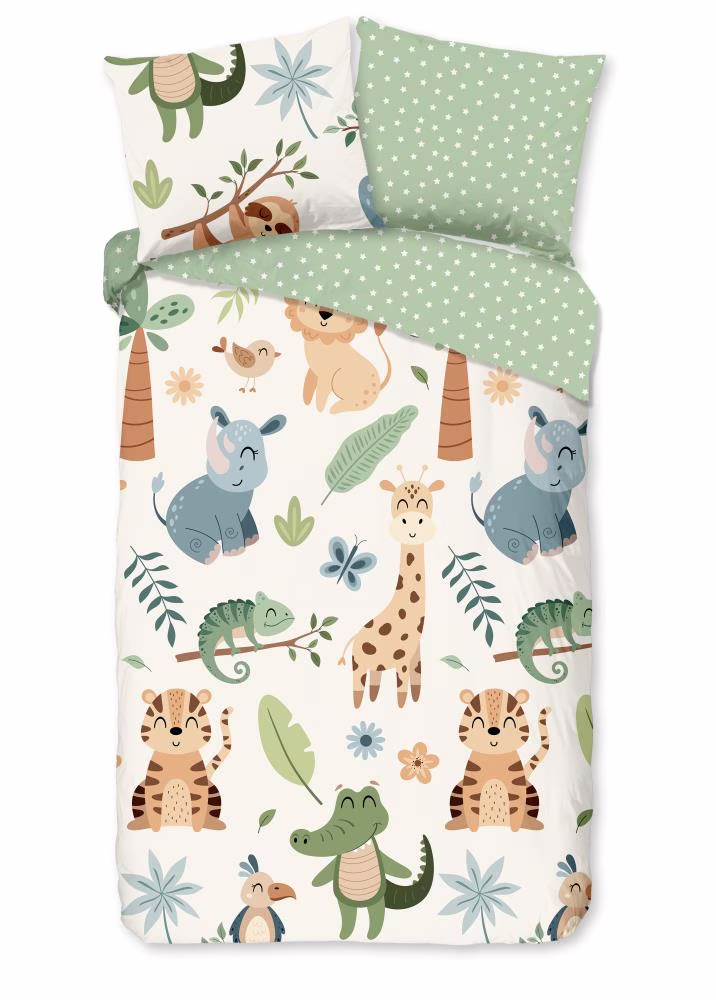 Kinderdekbedovertrek Sabah van Good Morning in de kleur groen, met een print van dieren. Het dekbedovertrek is gemaakt van 100% katoen. Deze kwaliteit is ademend, vochtabsorberend en voelt zacht en soepel aan. Dit leuke kinderdekbedovertrek is een leuke toevoeging aan iedere kinderkamer. Het kinderdekbedovertrek is geschikt voor ieder jaargetijde. Het katoenen 100% katoen is heerlijk koel in de zomer en geeft warmte in de winter.
