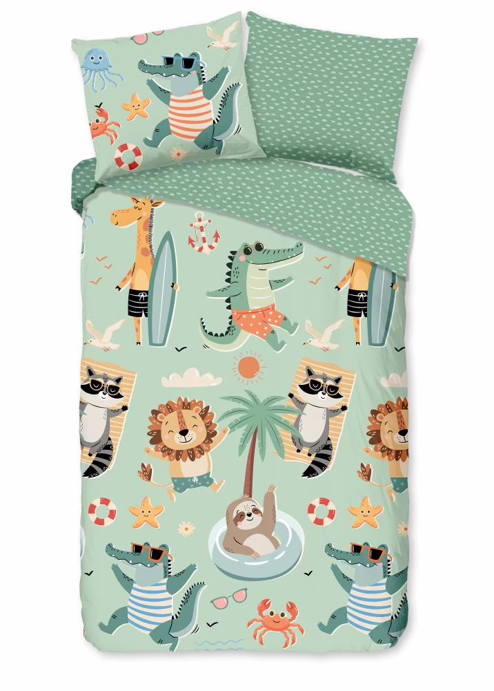 Kinderdekbedovertrek Soleil van Good Morning in de kleur groen, met een print van zomerse dieren. Het dekbedovertrek is gemaakt van 100% katoen. Deze kwaliteit is ademend, vochtabsorberend en voelt zacht en soepel aan. Dit leuke kinderdekbedovertrek is een leuke toevoeging aan iedere kinderkamer. Het kinderdekbedovertrek is geschikt voor ieder jaargetijde. Het katoenen 100% katoen is heerlijk koel in de zomer en geeft warmte in de winter.