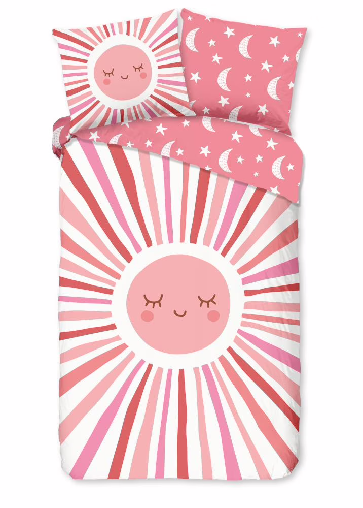 Kinderdekbedovertrek Sunny van Good Morning in de kleur roze, met een print van zon, maan en sterren. Het dekbedovertrek is gemaakt van 100% katoen. Deze kwaliteit is ademend, vochtabsorberend en voelt zacht en soepel aan. Dit leuke kinderdekbedovertrek is een leuke toevoeging aan iedere kinderkamer. Het kinderdekbedovertrek is geschikt voor ieder jaargetijde. Het katoenen 100% katoen is heerlijk koel in de zomer en geeft warmte in de winter.