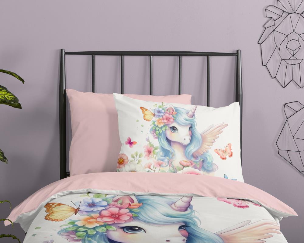 De voorkant heeft een sprookjesachtige eenhoorn met vleugels, die is omringd door bloemen en kleurrijke vlinders in zachte pasteltinten. Dankzij de digitale print zijn de details extra scherp, waardoor de kleuren langdurig mooi blijven. Een Kinderdekbedovertrek eenhoorn roze past perfect bij een magisch thema in de kinderkamer. De achterkant is uni roze. Hierdoor kun je gemakkelijk afwisselen en creëer je snel een rustige en harmonieuze uitstraling in de slaapkamer.100% katoen – natuurlijk, ademend en comfortabel