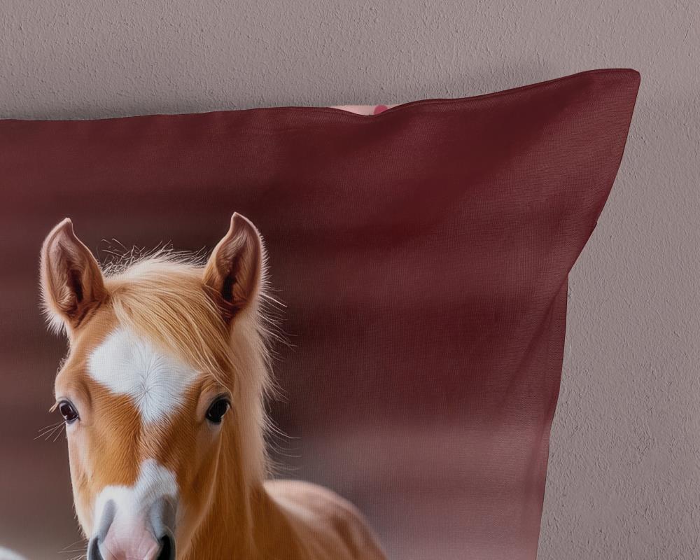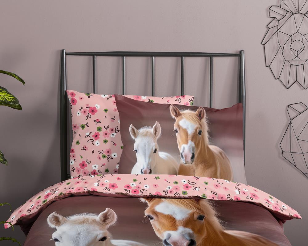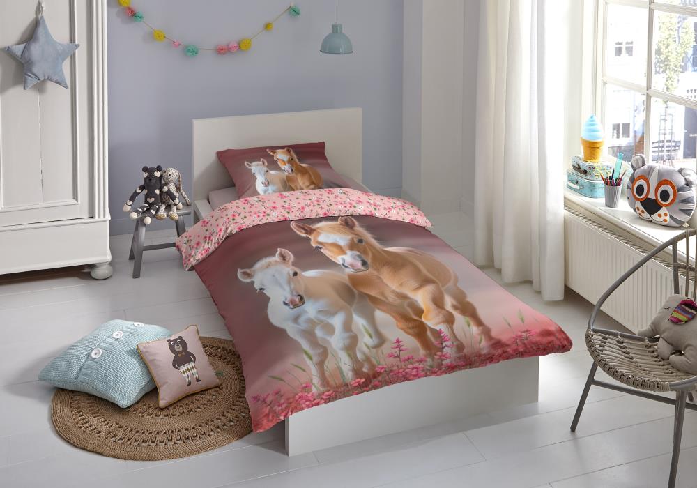 De voorkant van het dekbedovertrek toont twee jonge paarden, een witte en een bruine, die samen door een veld met bloemen lopen. Daarnaast zorgen de zachte achtergrond en natuurlijke kleuren voor een realistische en rustgevende uitstraling. De print is aangebracht met een digitale printtechniek, waardoor de details haarscherp zijn en de kleuren langdurig mooi blijven. Hierdoor ontstaat een levensecht effect met een luxe uitstraling. De achterkant is voorzien van een roze bloemenprint met kleine bloemetjes, zodat het geheel speels en perfect op elkaar afgestemd is. Bovendien zorgt de bloemen achterkant voor een vrolijk en rijk geheel.Kinderdekbedovertrek paard roze van 100% katoen
