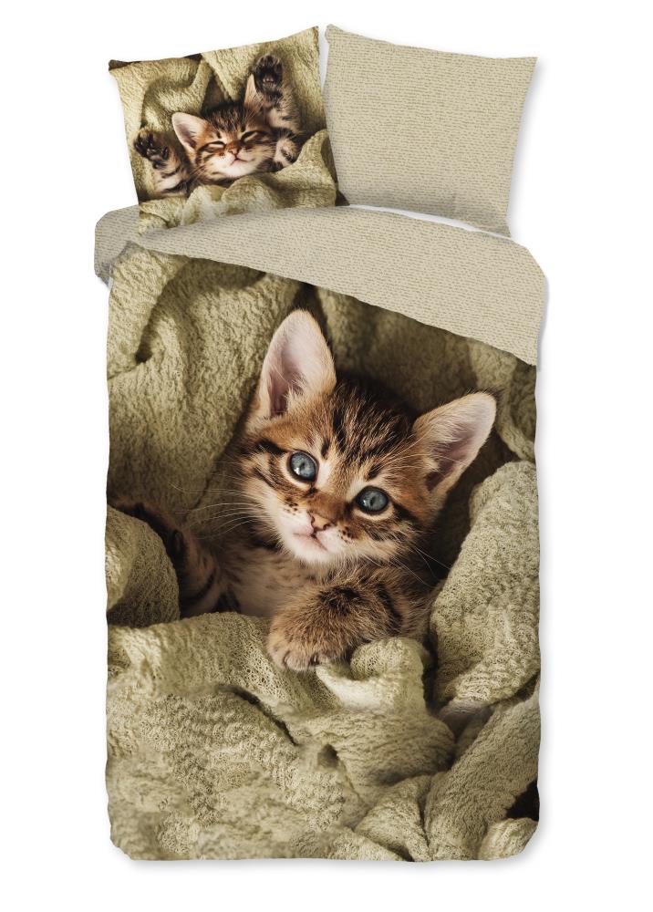 Op het overtrek zie je een donzig katje met grote, blauwe ogen dat knus ligt opgerold in een zachte groene deken. Op het bijpassende kussensloop ligt hetzelfde katje heerlijk te slapen met de pootjes omhoog — een vertederend beeld dat rust en geborgenheid uitstraalt. De realistische print en warme kleuren maken van dit dekbedovertrek een echte blikvanger.