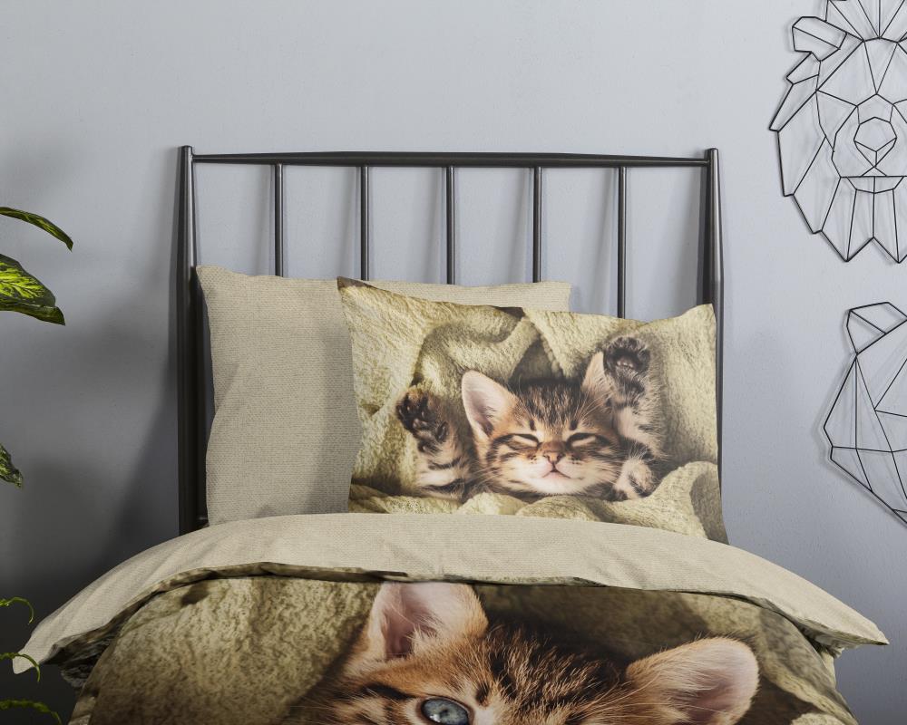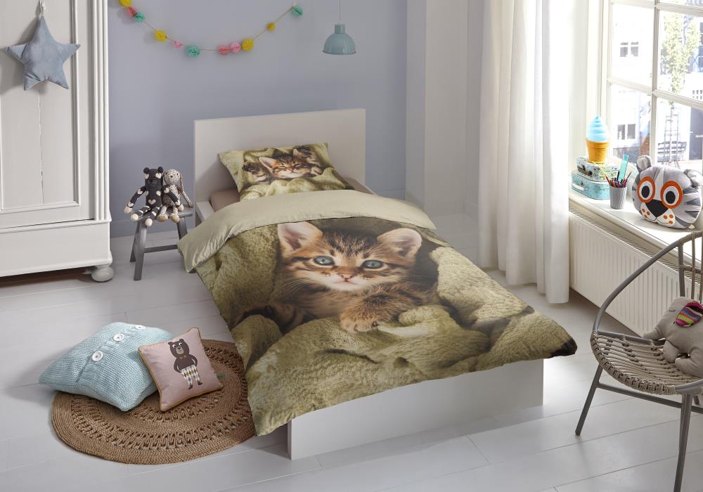 Kinderdekbedovertrek met lieve kitten fotoprint in zachte groentinten. Gemaakt van 100% katoen, omkeerbaar en genderneutraal. Zorgt voor comfort, warmte en een rustige nachtrust.