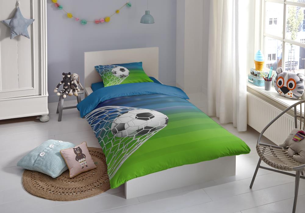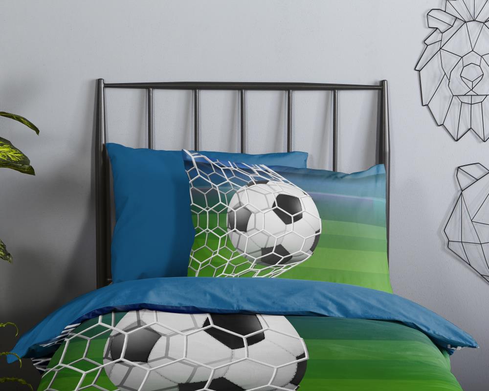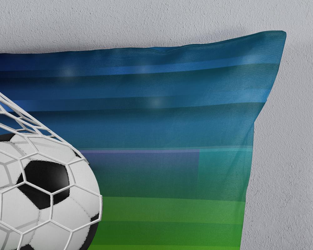 Ook op de kussensloop staat een voetbal die in het net vliegt. De combinatie van groen en blauw zorgt bovendien voor een fris contrast. Daardoor vormt het geheel één krachtige voetbalcompositie. Zo wordt dit kinderdekbedovertrek voetbal blauw een echte eyecatcher in de kinderkamer.