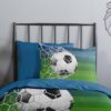 Stoer kinderdekbedovertrek voetbal blauw met realistische bal in doelnet. Digitaal geprint, 100% katoen, omkeerbaar en inclusief kussensloop. Perfect voor jonge voetbalfans die dromen van hun eigen winnende goal.