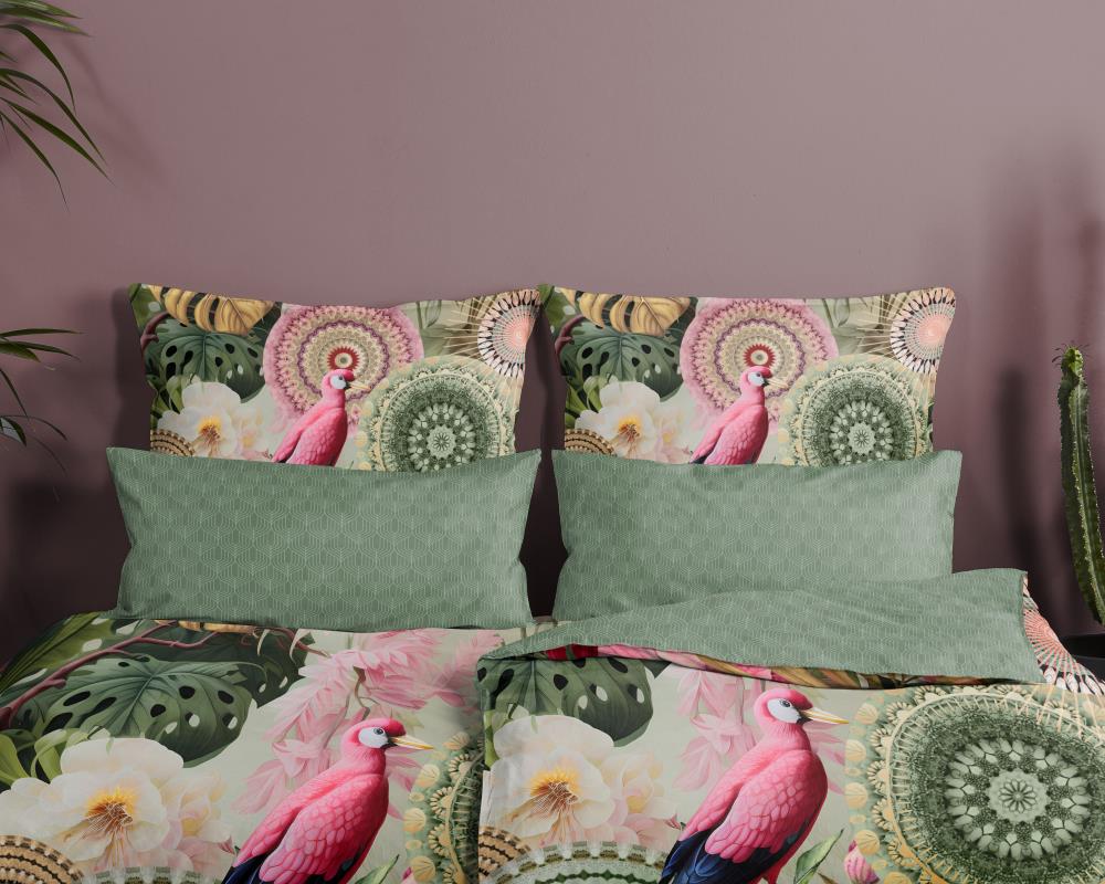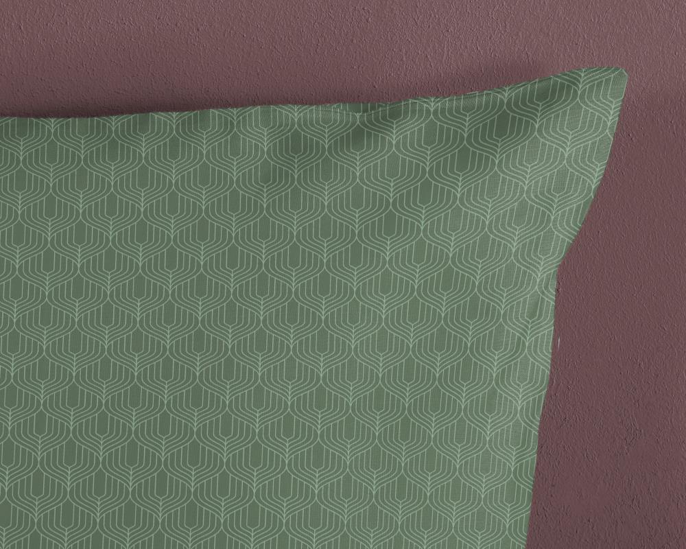 Satijnen kussensloop palay van HIP. Dit kussensloop in de kleur groen is een stijlvol kussensloop dat perfect past bij het bijbehorende dekbedovertrek palay van HIP. Het kussensloop is zelfs gemaakt van dezelfde print als de achterkant van het dekbedovertrek.